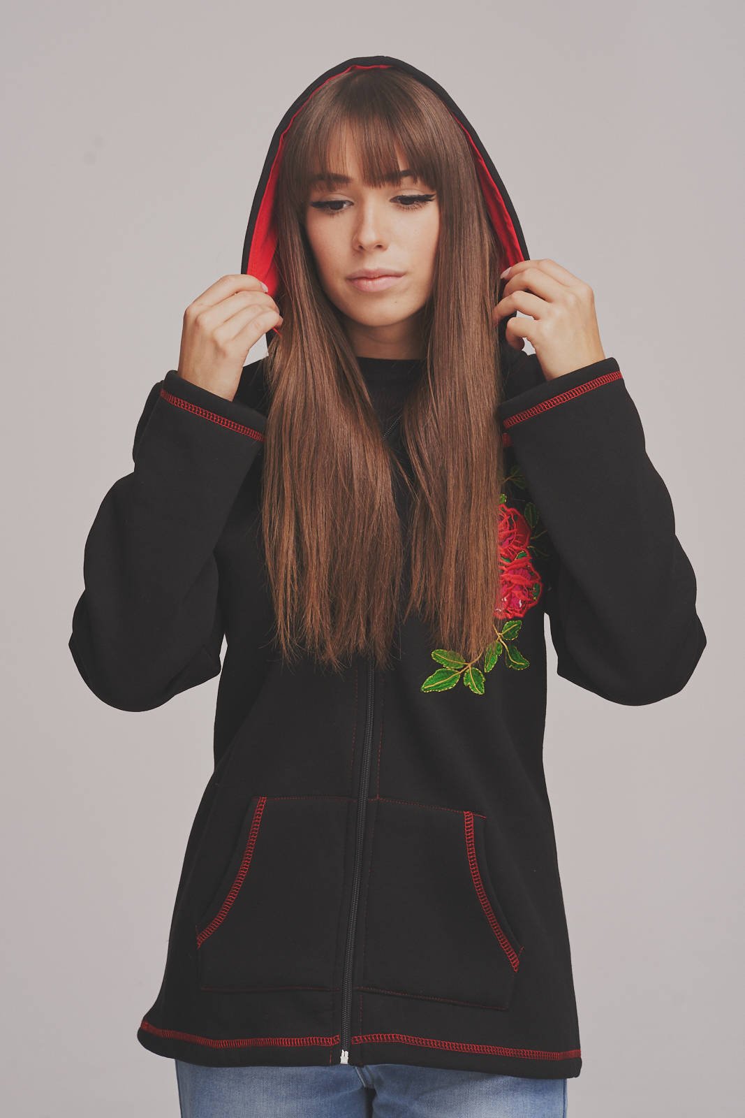 Bavlnená čierna mikina s bohatou výšivkou ruží. Mikina má vpredu vrecká a kapucňu. Veľmi pohodlný strih s predĺženým chrbtom. Vhodné pre mnoho štýlov.