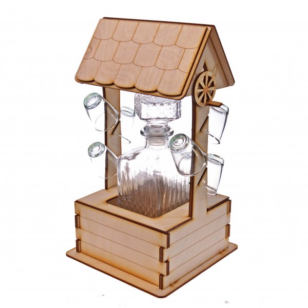 Darčeková drevená studňa s fľaškou a štamperlíkmi. Darčeková súprava sa hodí ako darček ku každej príležitosti. Darčeková studňa je pekná dekorácia a tak isto aj praktickým doplnkom. Do fľašky si môžete nabrať obľúbený alkohol a budete ho mať vždy po ruke aj so štamperlíkmi.