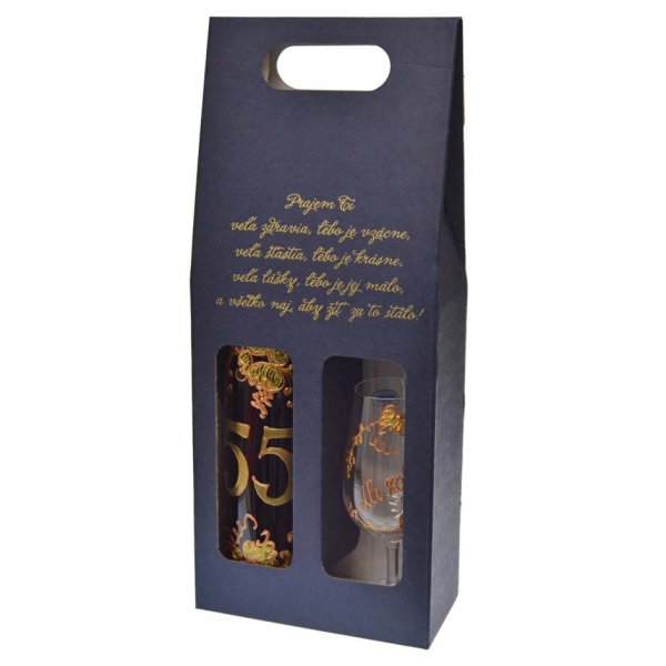 Darčekový set víno a pohár k 55. narodeninám s krásnym veršom, ktorý ulahodí každej duši. 55 máme len raz v živote preto by darček na 55 mal zanechať pamiatku. Originálny darček pre každého jubilanta.