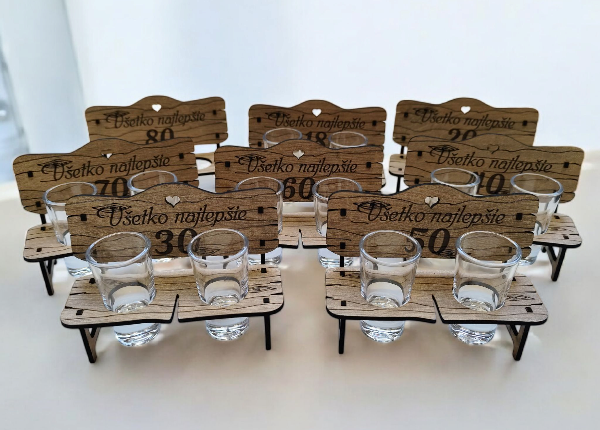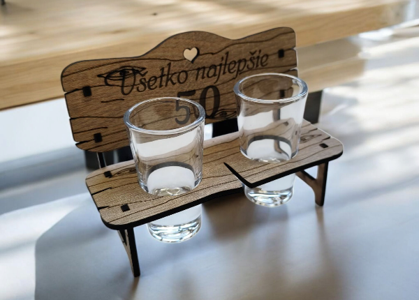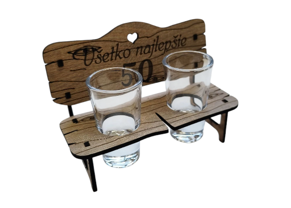 Drevená dekorácia v podobe štýlovej lavičky na štamprlíky je skvelým darčekom k narodeninám pre milovníkov dobrej nálady. Táto originálna sada na alkohol obsahuje drevenú lavičku s presne vyrezanými otvormi na štamprlíky, ktoré sú súčasťou balenia.