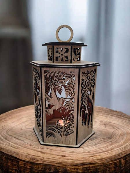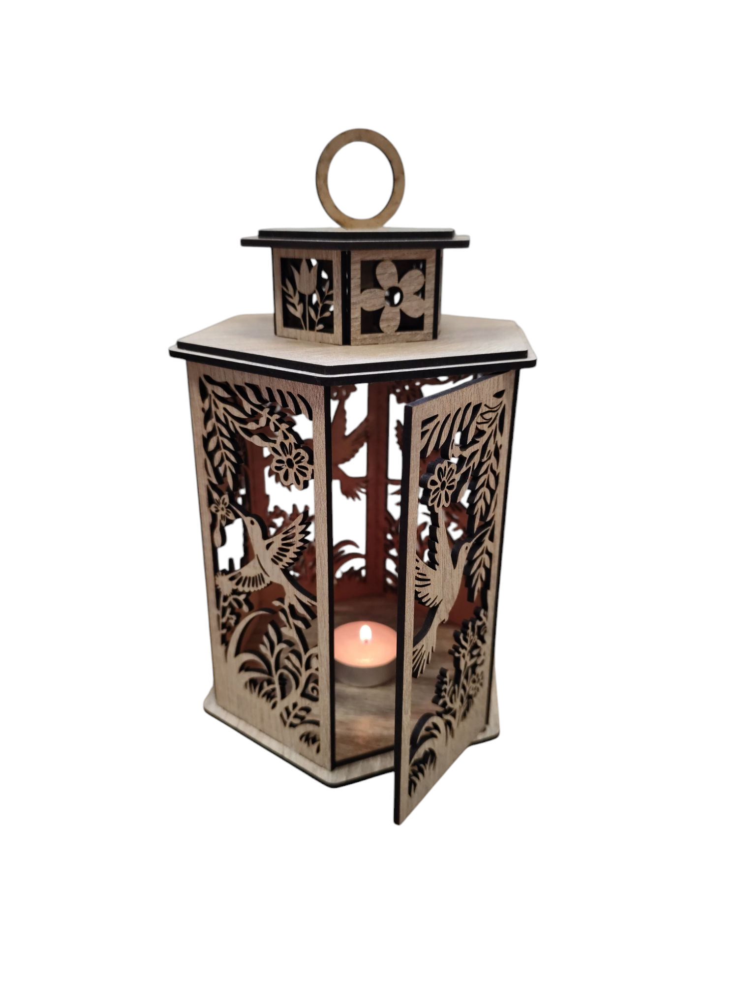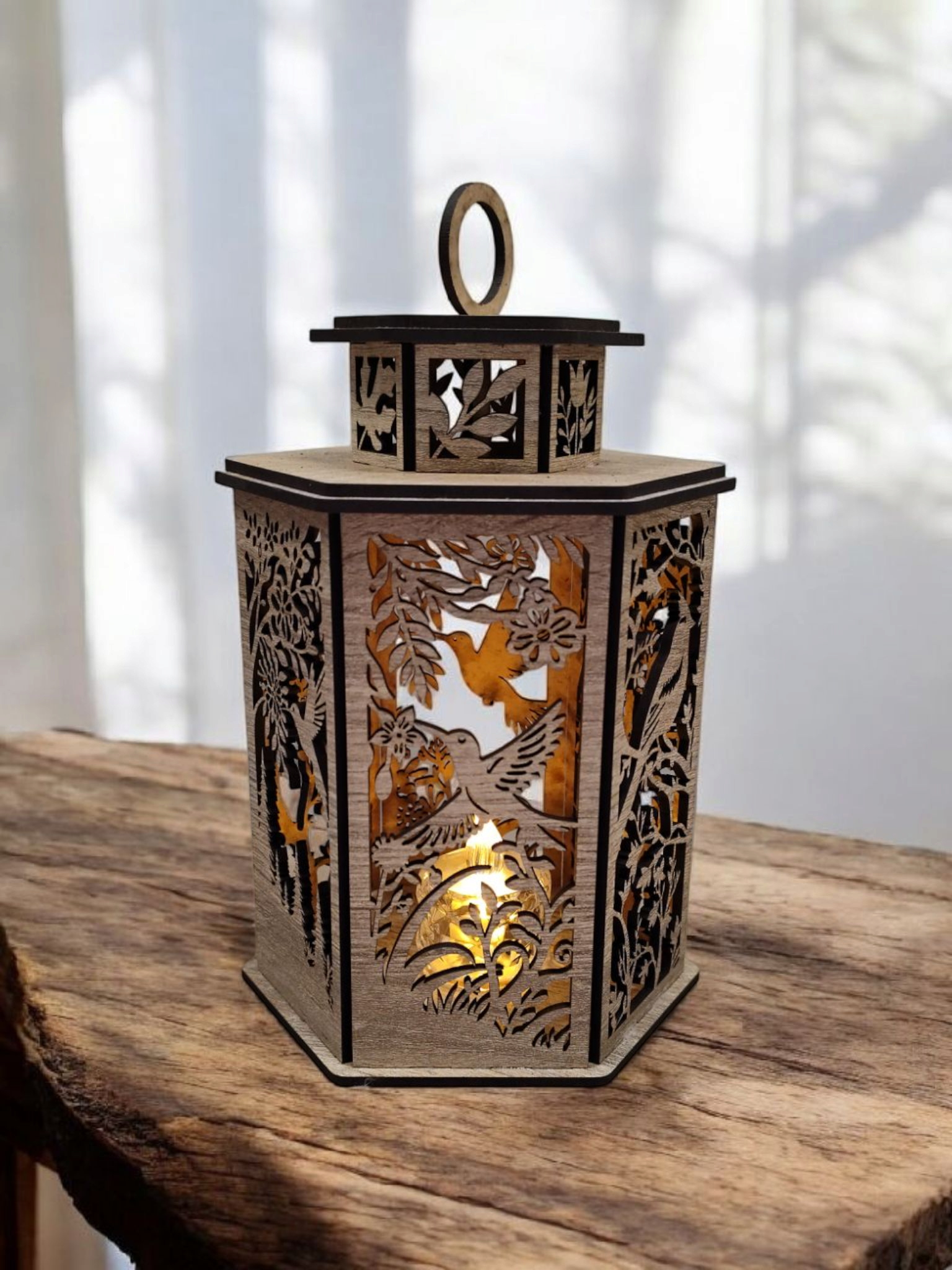 Táto drevená lucerna s jemným motívom vtákov je jedinečnou dekoráciou, ktorá vnesie do vášho domova prírodnú eleganciu a útulnú atmosféru. Vyrobená z kvalitného dreva, jej precízne spracovanie a detailné vyrezávanie dodávajú priestoru harmóniu a štýl.