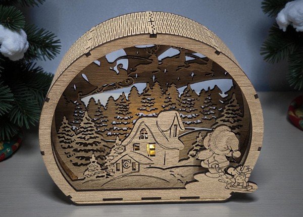 Vďaka vrstvenému 3D efektu pôsobí dekorácia hlboko a pri zapnutí svetielka sa celá scéna mení na magický zimný svet. Výroba je precízna, s krásnymi čistými rezmi a výraznou kresbou dreva.