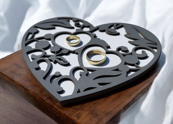 Toto drevené srdce na obrúčky je dokonalým doplnkom pre váš svadobný obrad. Vyrobené z kvalitného dreva, jeho elegantný dizajn dodáva svadobnej atmosfére jedinečný šarm. Tento podnos na svadobné obrúčky je nielen praktický, ale aj estetický prvok, ktorý sa stane krásnou spomienkou na váš veľký deň.