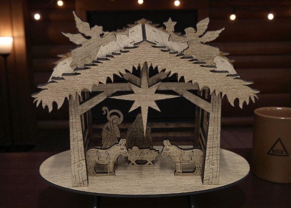 Drevený betlehem so strieškou – umelecky vyrezávaná vianočná svätyňa z prírodného dreva