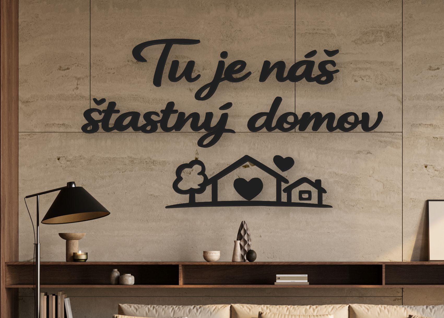 ✨ Elegantné písmo v kombinácii s motívom domčeka, stromu a srdiečok vytvára harmonický celok, ktorý pôsobí moderne, no zároveň veľmi útulne. Ideálny doplnok do obývačky, spálne či predsiene.