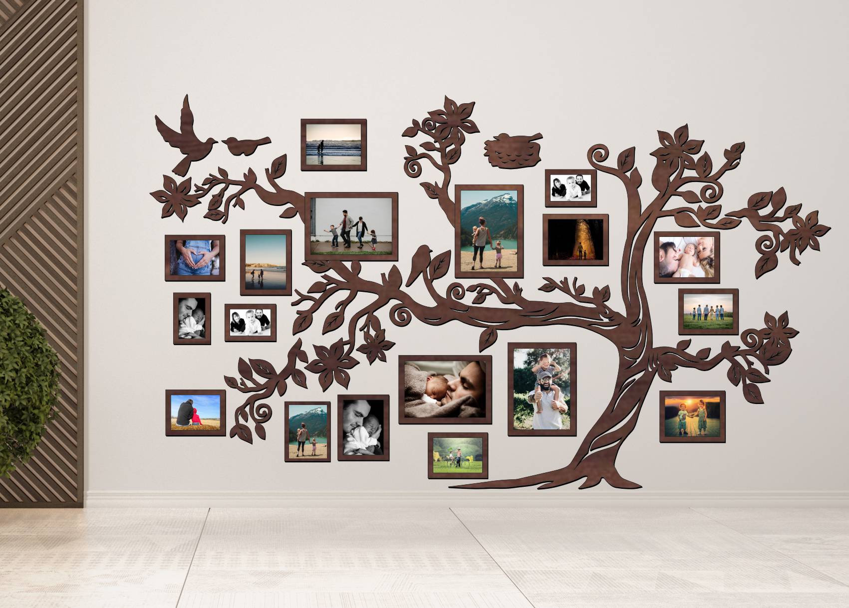 Dekorácia je vyrobená z lakovaného HDF dreva, ktoré zaručuje hladký povrch, elegantný vzhľad a dlhú životnosť. Precízne laserové spracovanie zabezpečuje čisté línie a detailné vyhotovenie každého prvku stromu. Rozmery jednotlivých fotorámikov aj odporúčané veľkosti fotografií sú prehľadne zobrazené na fotografii v galérii, kde zákazník vidí kompletné rozloženie dekorácie aj všetky rozmery na jednom mieste.