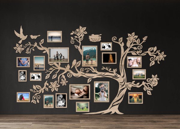Drevený fotorámik na stenu v tvare rodinného stromu s vtáčikmi a hniezdom je výrazná dekorácia, ktorá vytvorí z vašej steny osobnú galériu rodinných spomienok. Bohato tvarované vetvy, jemné listy, vtáčiky a symbolické hniezdo predstavujú domov, rodinu a bezpečie – hodnoty, ktoré tento motív prirodzene vyžaruje.
