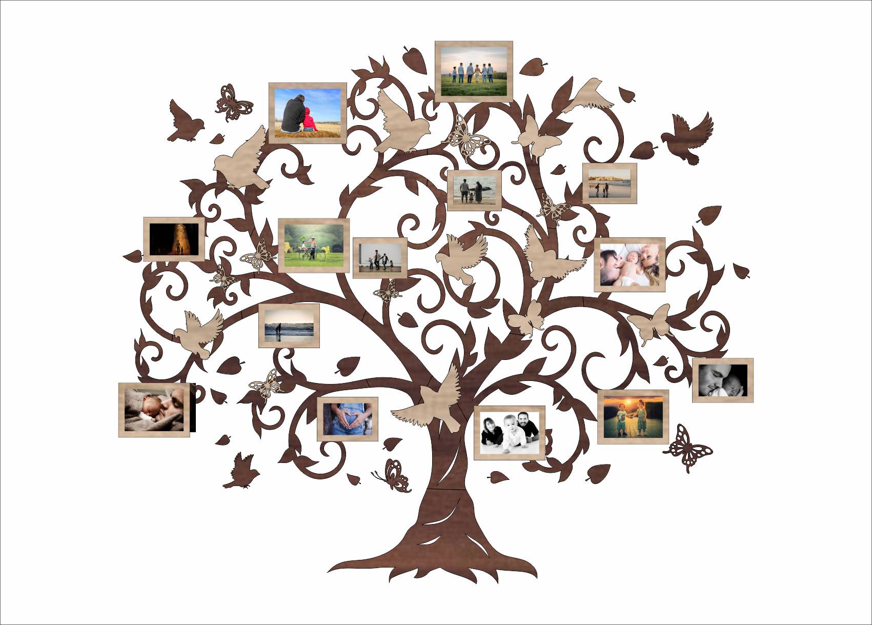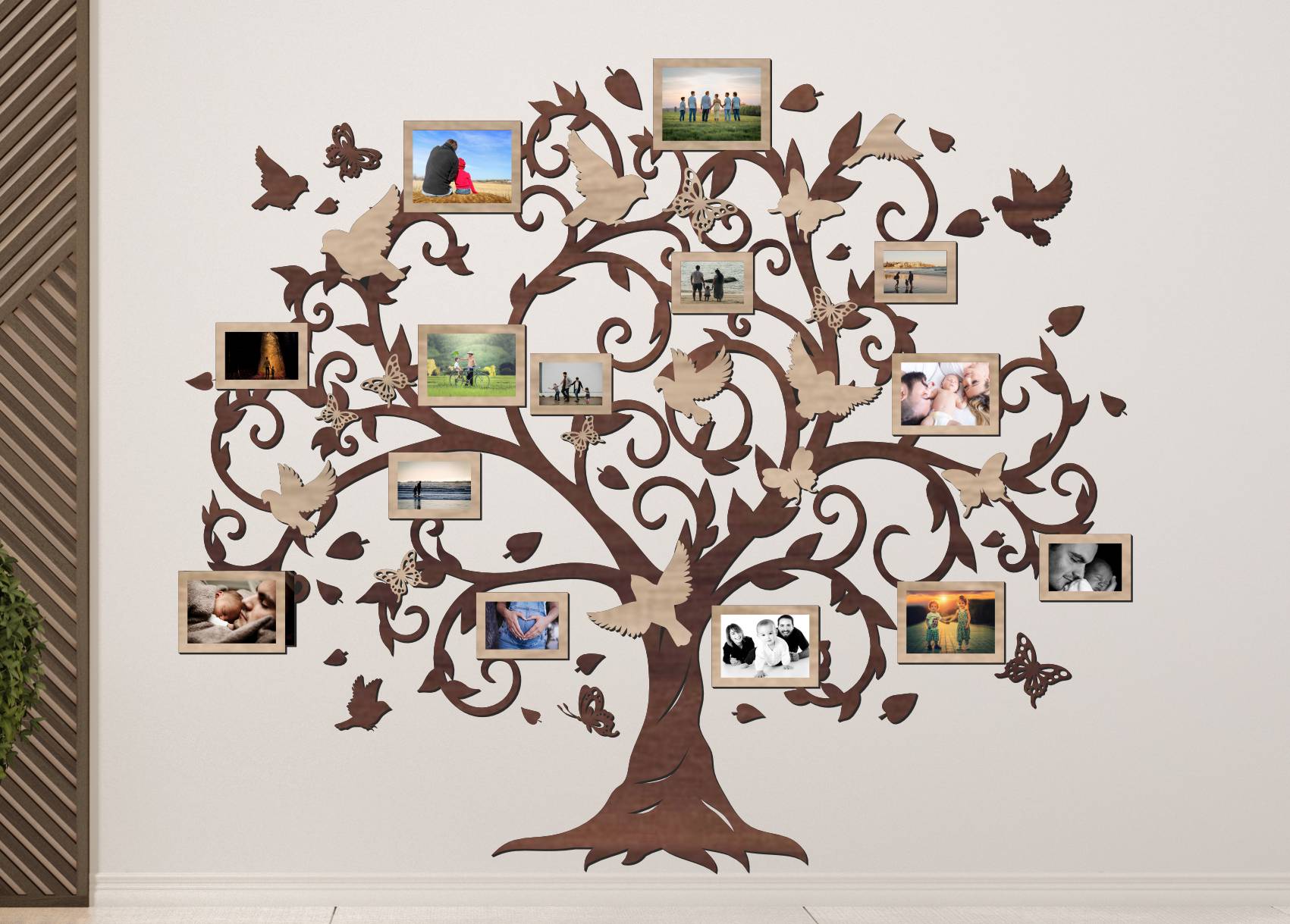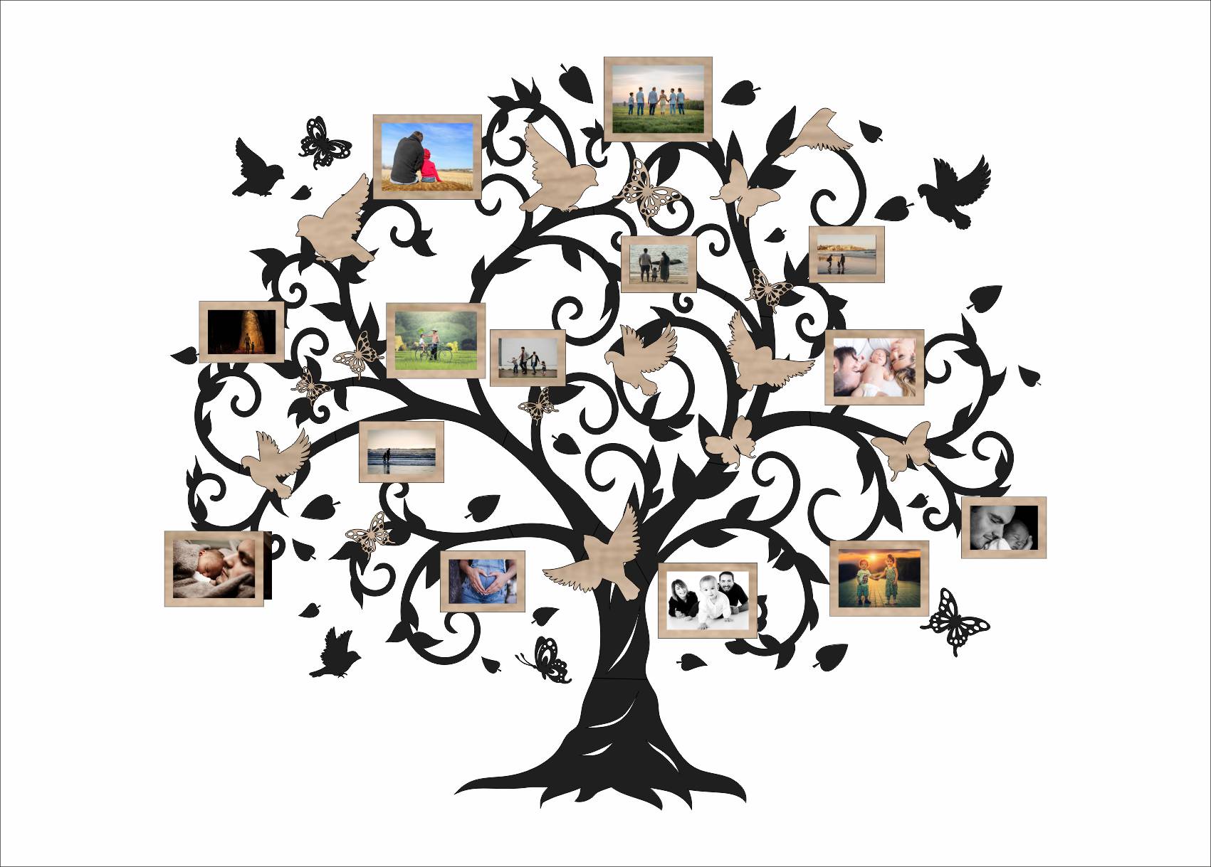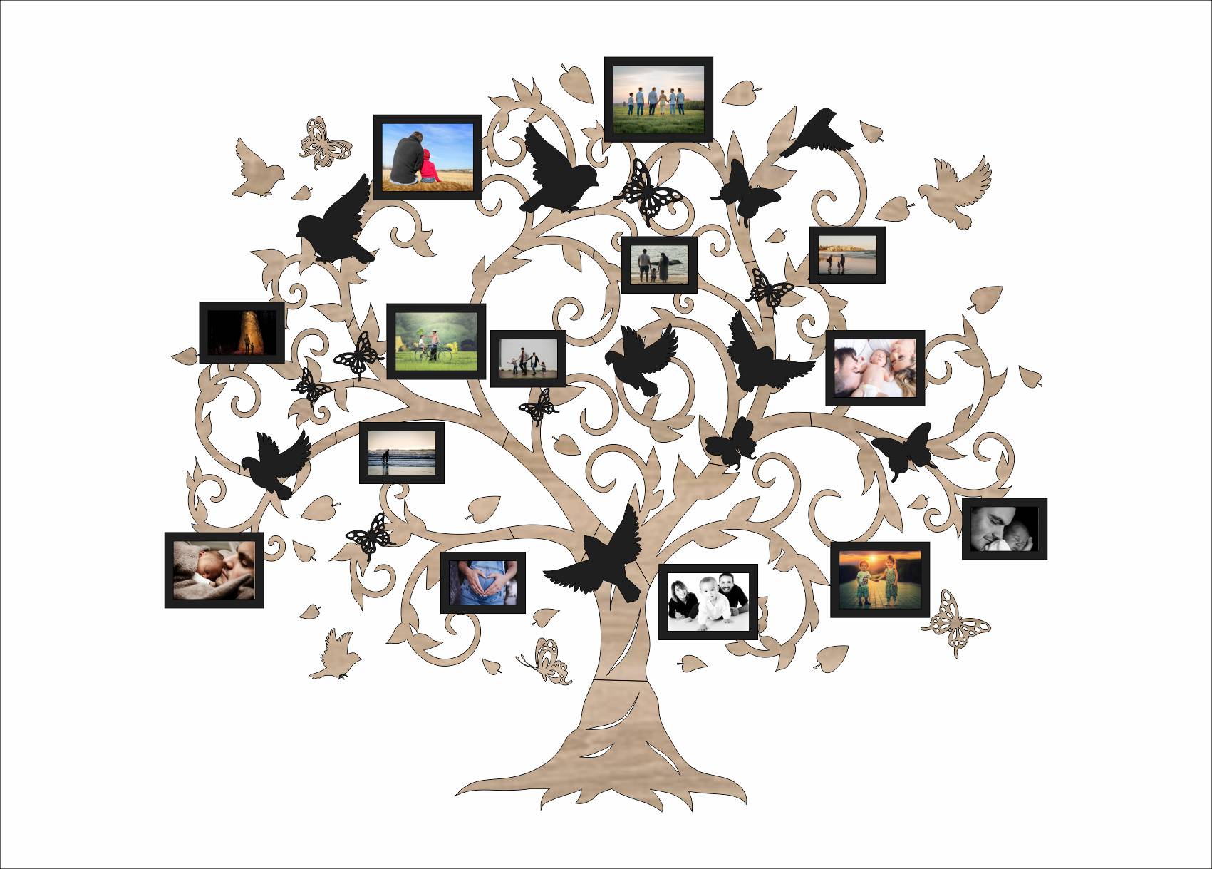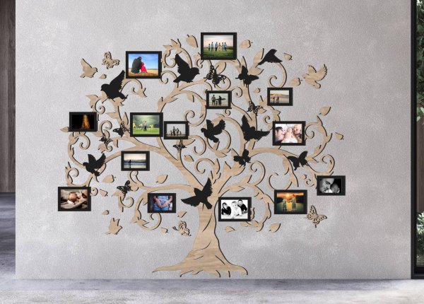 Drevený fotorámik na stenu v tvare rodinného stromu s vtáčikmi a motýľmi je výrazná dizajnová dekorácia, ktorá premení prázdnu stenu na osobnú galériu rodinných spomienok. Bohato zdobené vetvy, jemné ornamenty, vtáčiky a motýle vytvárajú harmonický a živý motív, ktorý pôsobí ľahko, elegantne a zároveň veľmi osobne.