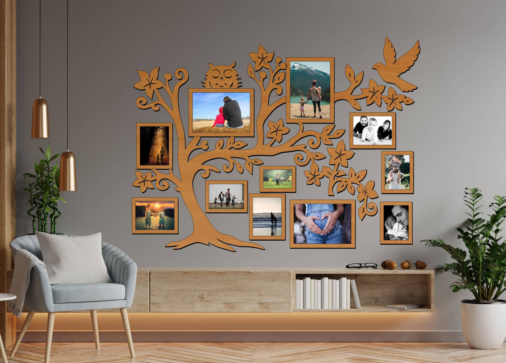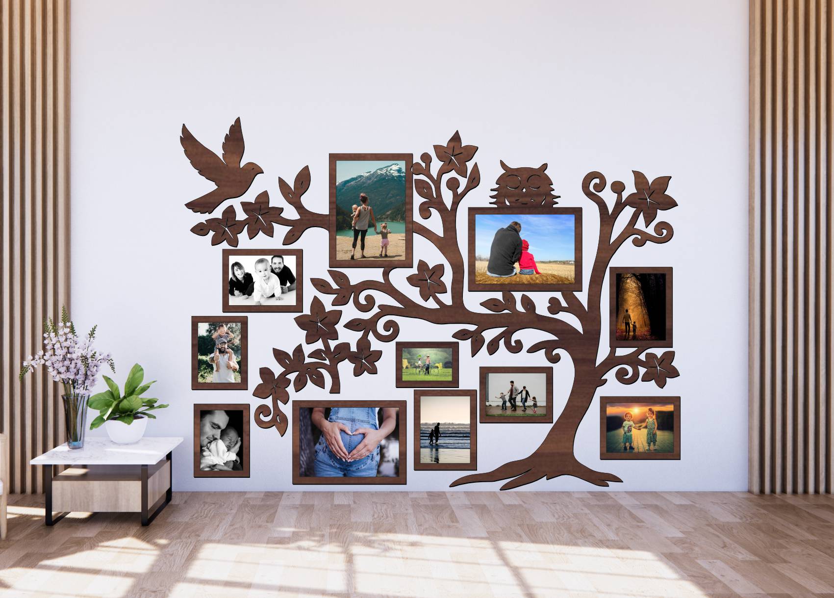 Drevený fotorámik na stenu – Rodinný strom so sovičkou a vtáčikom je originálna rodinná dekorácia, ktorá spája fotografie, prírodný motív a jemné symbolické prvky do jedného harmonického celku. Motív stromu doplnený o sovičku a vtáčika pôsobí pokojne, rodinne a zároveň dekoratívne.