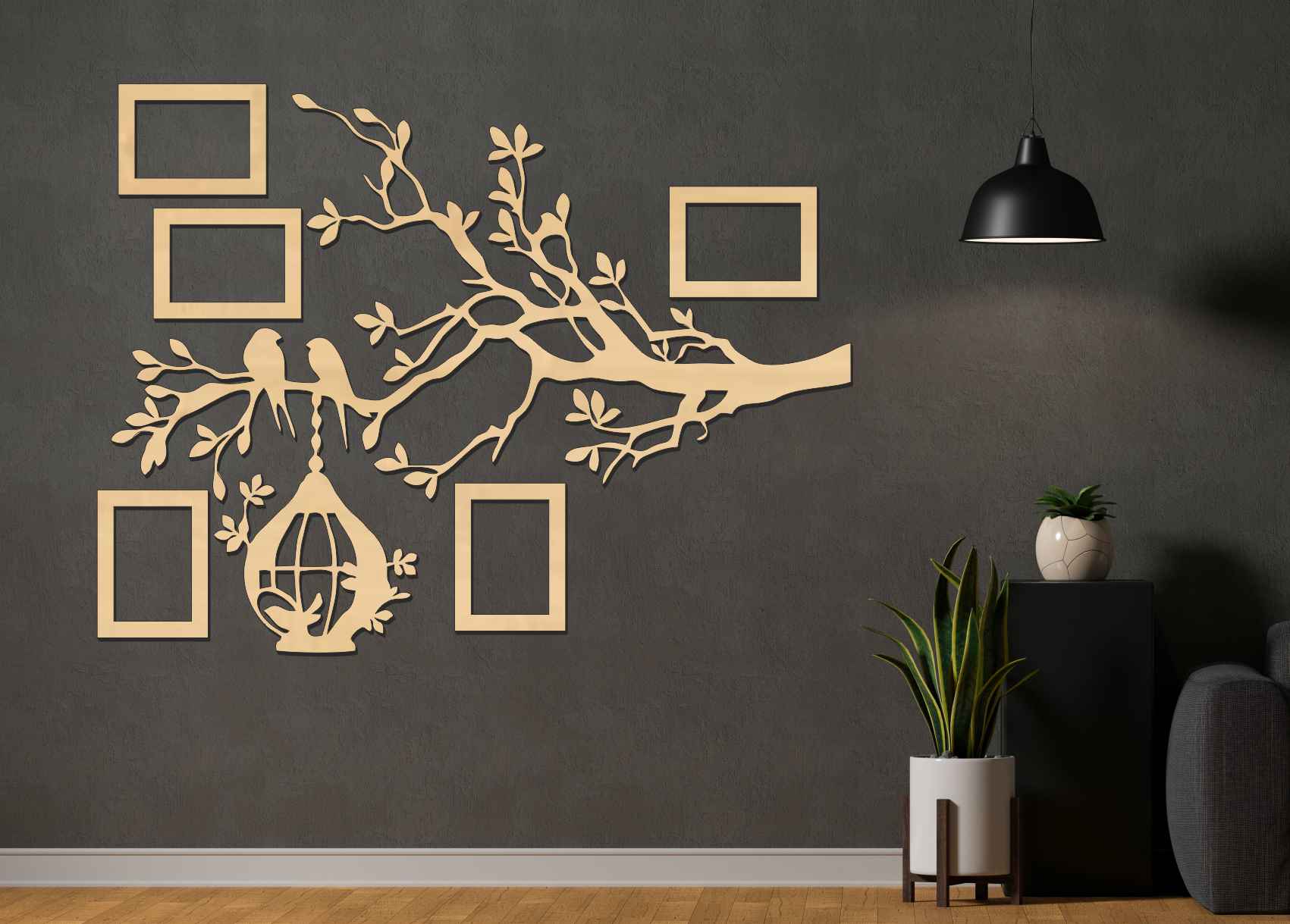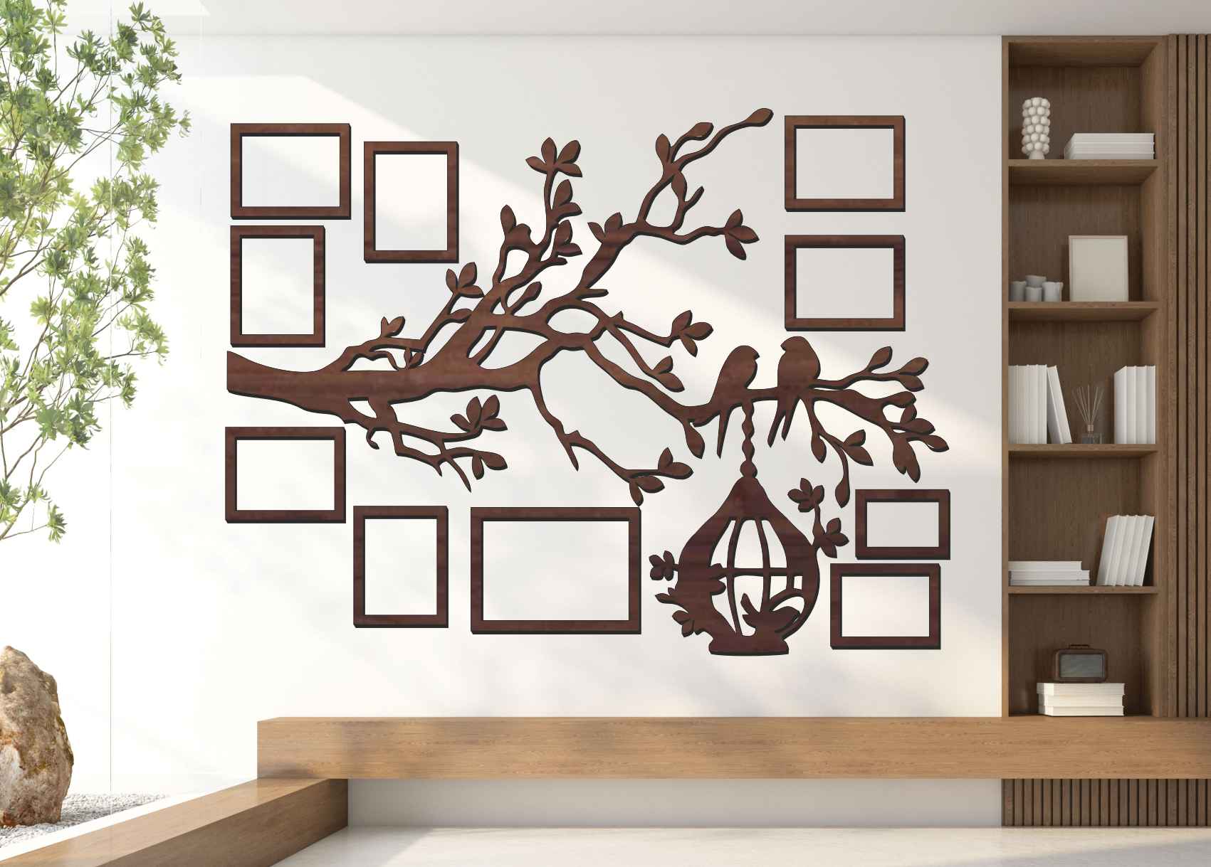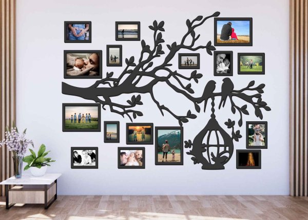 Drevený fotorámik na stenu v tvare rodinného stromu je originálna dekorácia, ktorá spája dizajn, emóciu a rodinné spomienky do jedného výrazného celku. Silueta stromu s jemnými vetvami, vtáčikmi a dekoratívnou klietkou vytvára harmonický motív, okolo ktorého sú rozmiestnené fotorámiky s vašimi najkrajšími fotografiami.