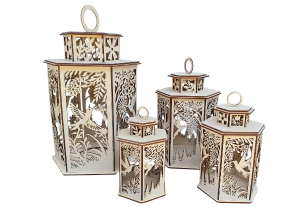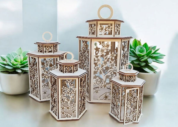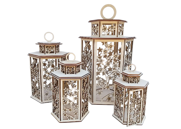- Drevený lampáš s jemným kvetinovým dizajnom