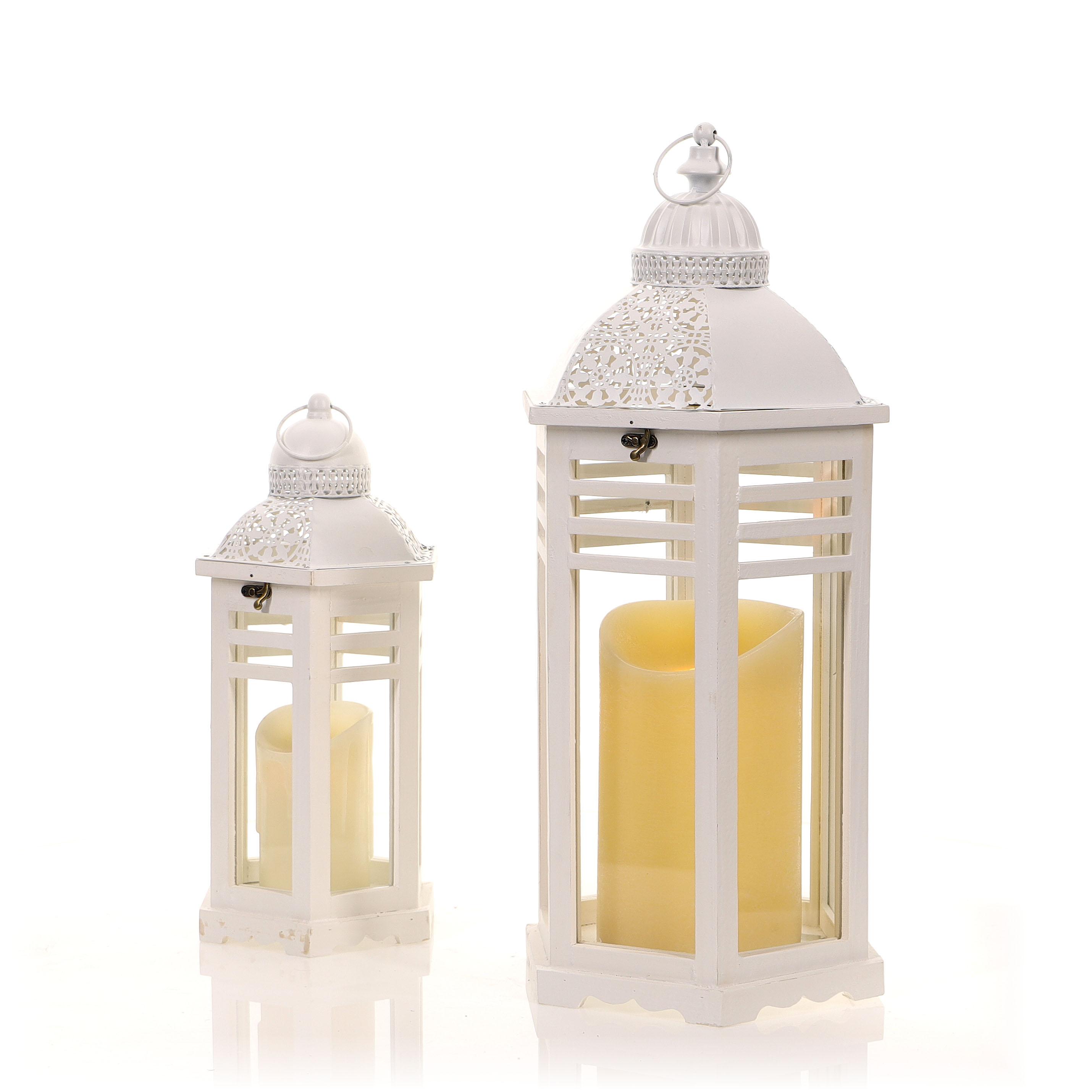 Drevený lampáš bielej farby je originálnou dekoráciou do domácnosti či interiéru alebo exteriéru.