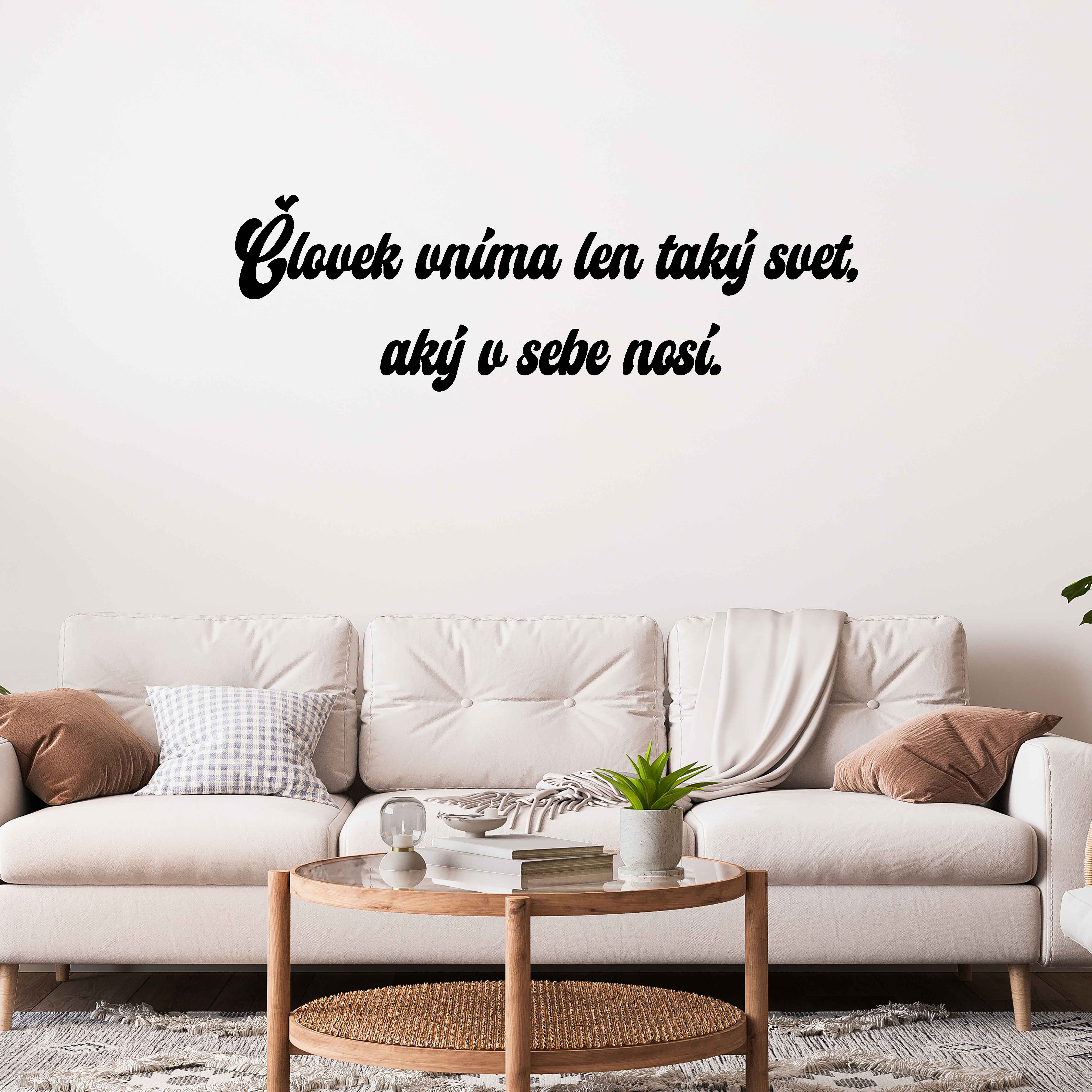 Drevený nápis na stenu - Človek vníma len taký svet, aký v sebe nosí.