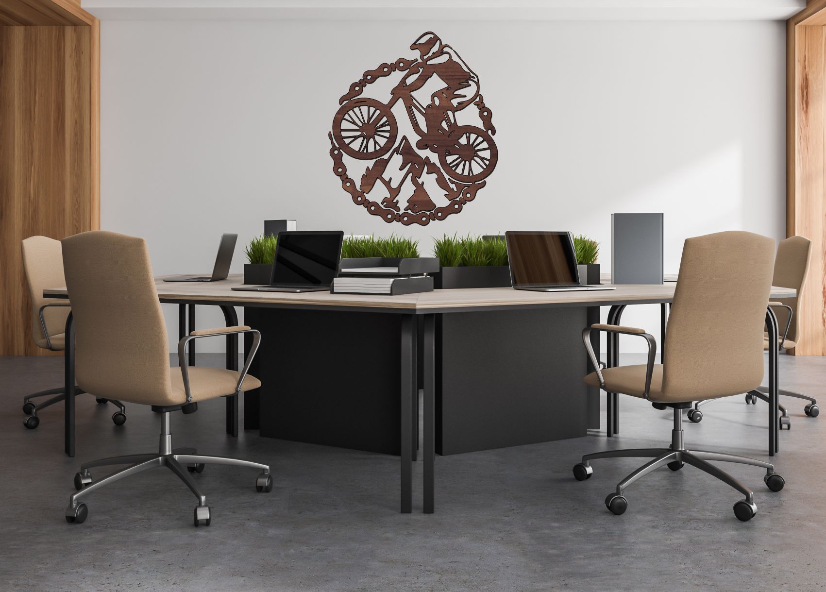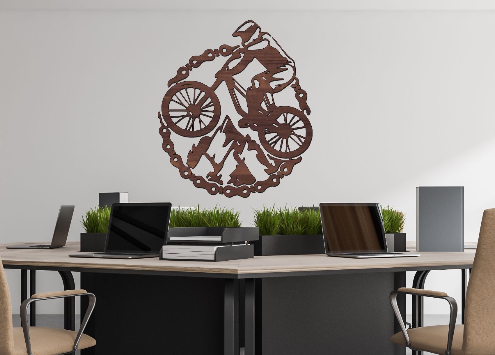 Dominantným prvkom je jazdec na horskom bicykli v pohybe, doplnený o horské vrcholy a detail reťaze, ktorý uzatvára celý motív do kompaktného kruhu. Práve tento kruhový tvar pôsobí harmonicky a zároveň veľmi moderne, čím vytvára výrazný dizajnový prvok na stene.