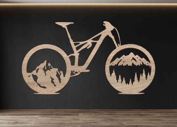 Drevený obraz na stenu – Bicykel s horami: Spojenie prírody a dobrodružstva