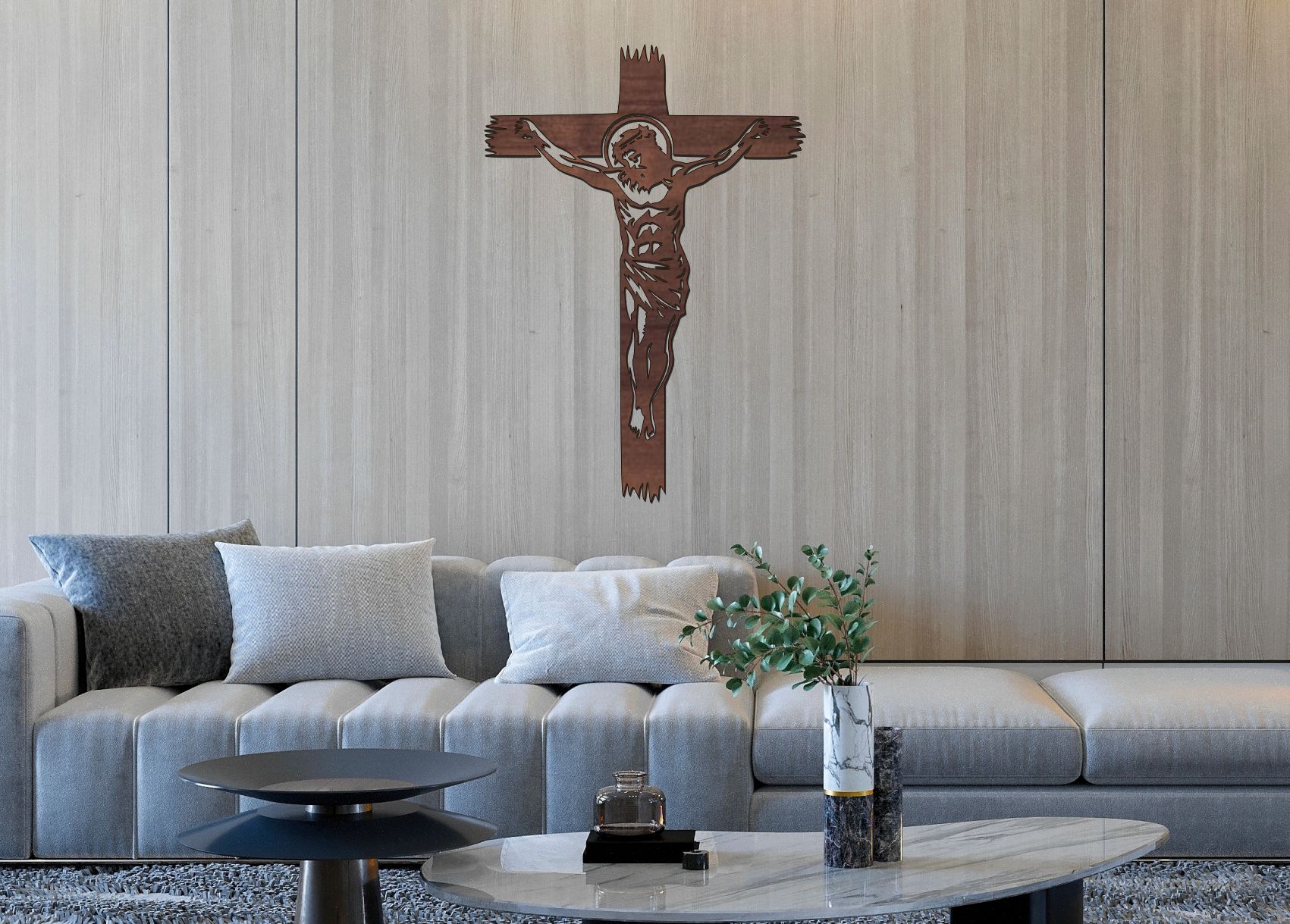 Vyrezávaný z kvalitného HDF dreva s detailným spracovaním, prináša do priestoru atmosféru pokoja, úcty a viery. Jednoduchý, no výrazný kontrast čiernej siluety na svetlom podklade pôsobí dôstojne a elegantne.