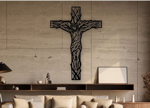 Precízne spracovaný dizajn spája kríž a postavu Ježiša do jedného harmonického umeleckého celku. Detailné laserové rezanie zvýrazňuje jemné línie a vytvára elegantný tieňový efekt na stene.