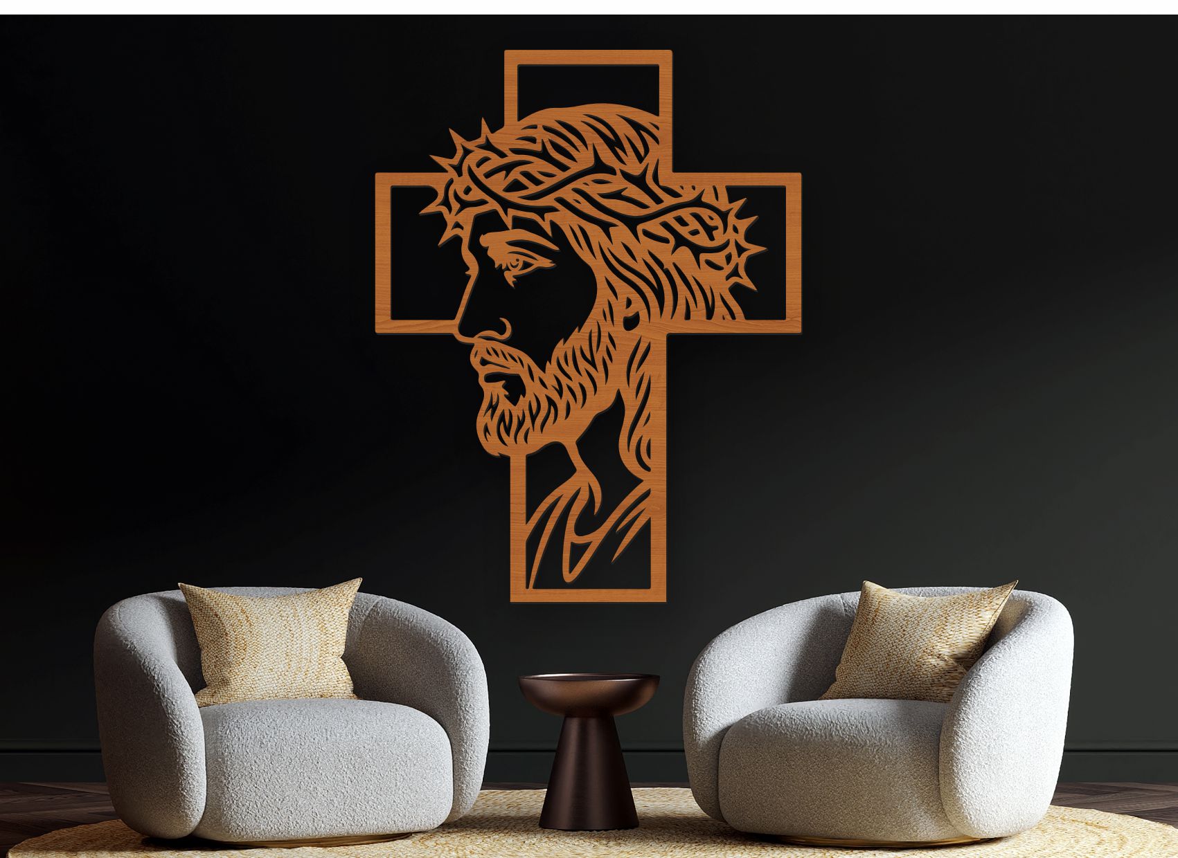 Obraz krásne vynikne v obývačke, spálni, modlitebnom priestore, pracovni alebo vstupnej hale. Vďaka prírodnému vzhľadu dreva pôsobí teplo, harmonicky a ľahko sa kombinuje s moderným aj rustikálnym interiérom.
