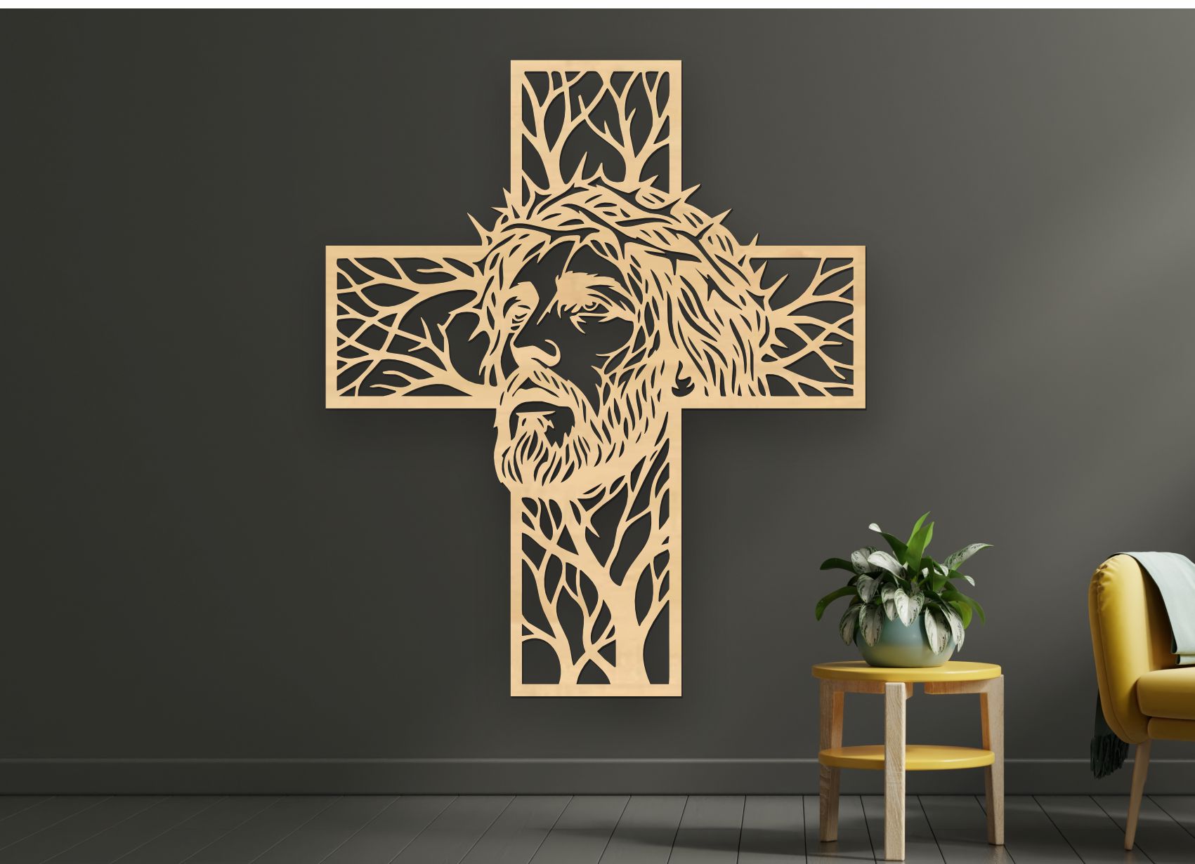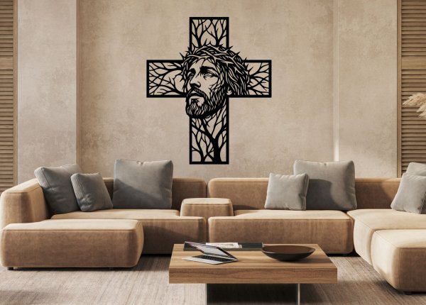Precízne laserové rezanie zvýrazňuje jemné línie tváre, tŕňovej koruny aj dekoratívneho kríža. Moderný dizajn vytvára pôsobivý tieňový efekt na stene a hodí sa do klasického aj moderného interiéru.