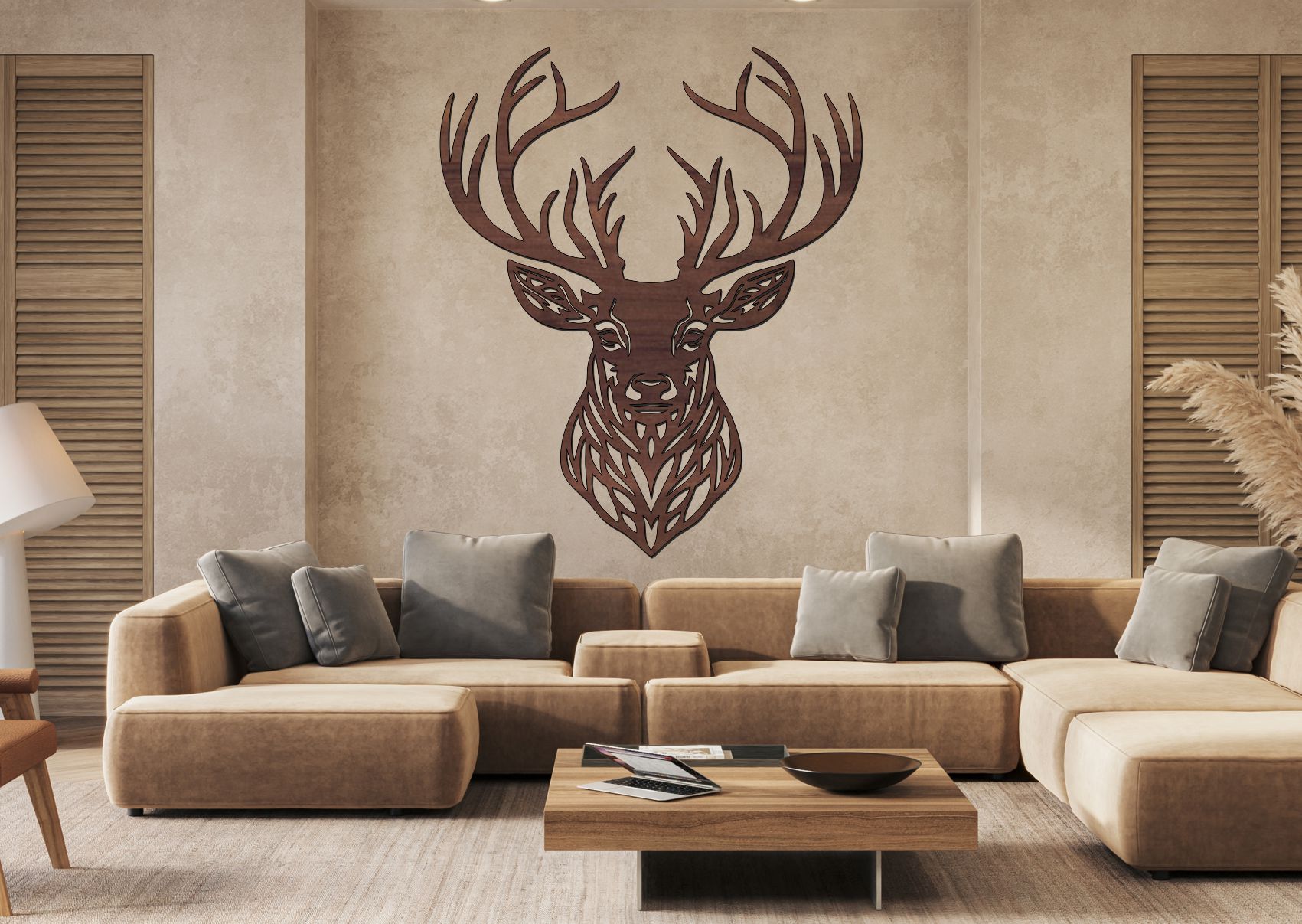 Drevený obraz – Ornamentálna hlava jeleňa je elegantná, moderná a detailne prepracovaná prírodná dekorácia. Ornamentálne línie dodávajú klasickému motívu jeleňa nový, dizajnový charakter, ktorý krásne vynikne v obývačke, pracovni, na chate aj v poľovníckej miestnosti.