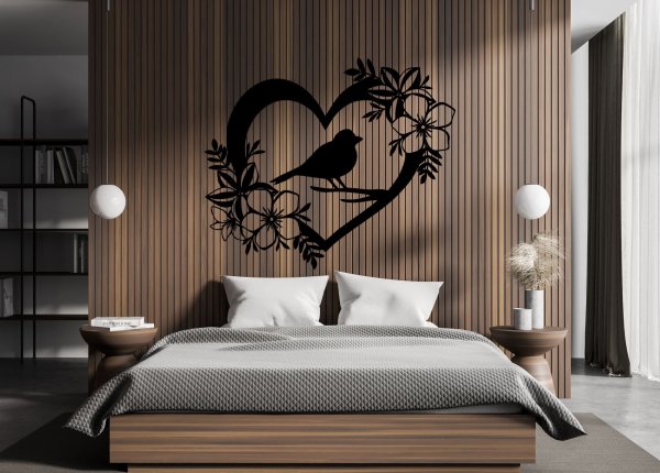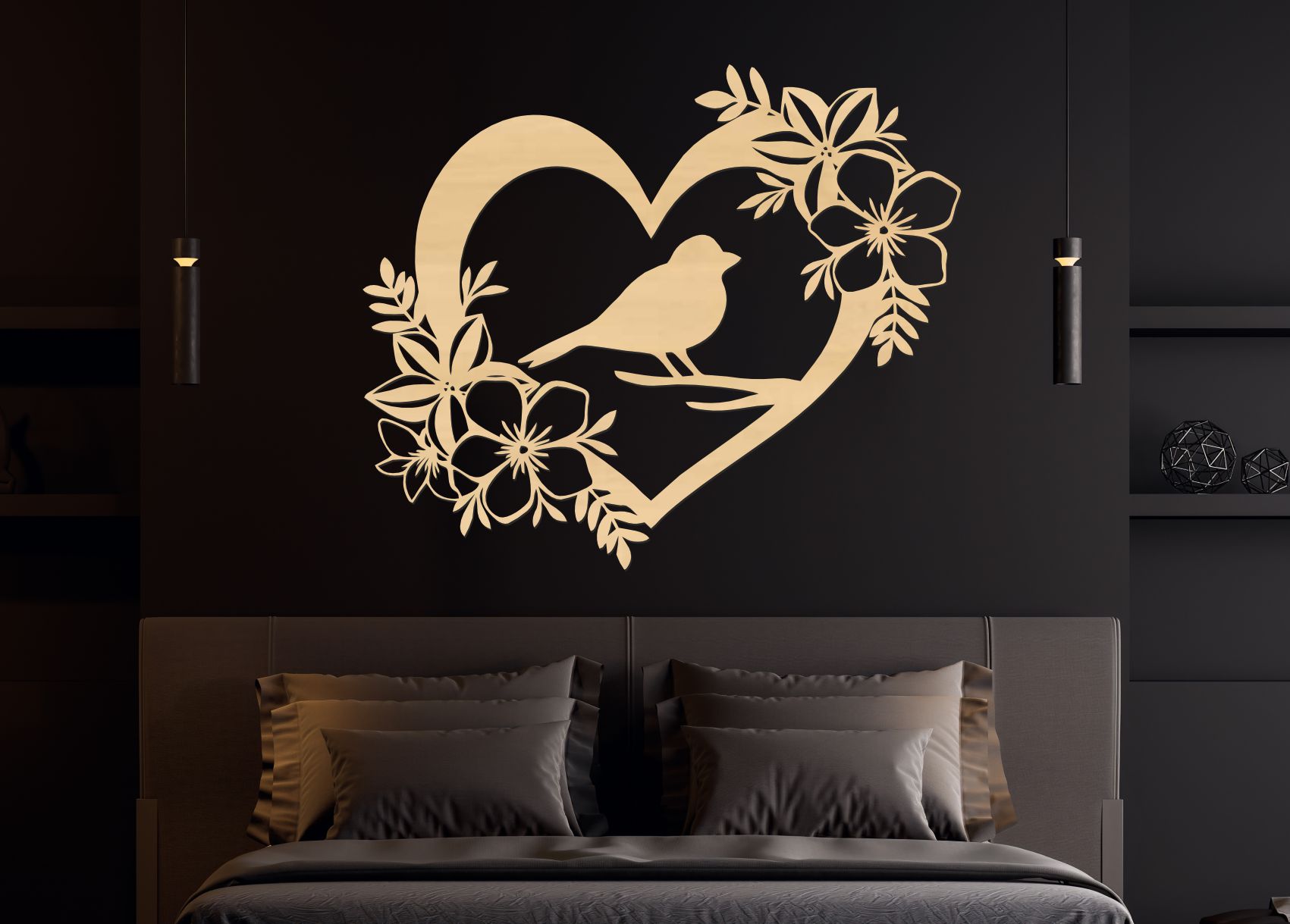 Drevený obraz – Srdce s vtáčikom a kvetmi je nežná, romantická a veľmi elegantná dekorácia vhodná do obývačky, spálne, predsiene aj do chalupárskeho interiéru. Kombinácia jemných kvetov, prírodných línií a malého vtáčika vytvára harmonický a hravý dizajn, ktorý rozžiari každý priestor.