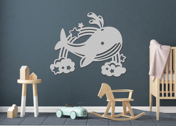 Rozkošný drevený obrázok s motívom veľryby plávajúcej po dúhe prinesie do detskej izbičky pokoj, farby a úsmev.