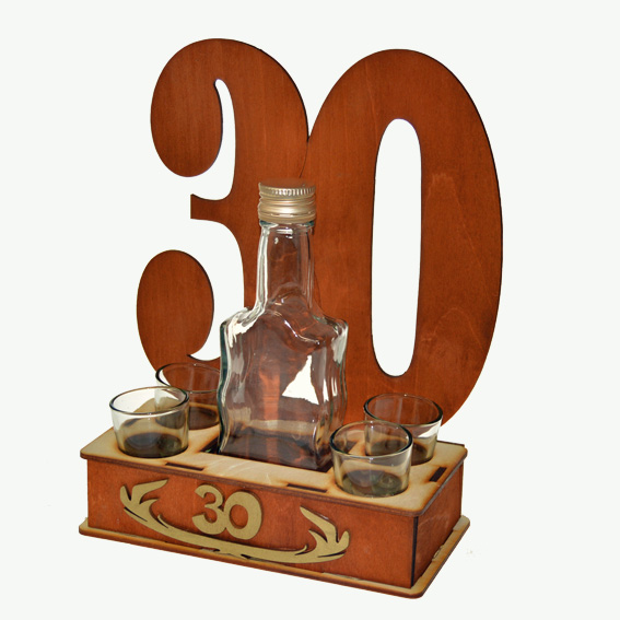 Drevený stojan s fľaškou a štamperlíkmi s vekom 30