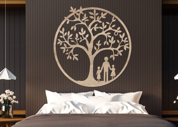 🌳 Drevený strom života – Rodinný kruh je symbolická nástenná dekorácia, ktorá spája motív stromu života s kruhom predstavujúcim jednotu a nekonečné rodinné puto. Pod korunou stromu stoja siluety rodiča a dvoch detí, čo vytvára krásny symbol rodiny, ochrany a spoločného života. Tento drevený strom života na stenu je ideálnym doplnkom do interiéru pre každého, kto chce zdôrazniť význam rodiny a domova.