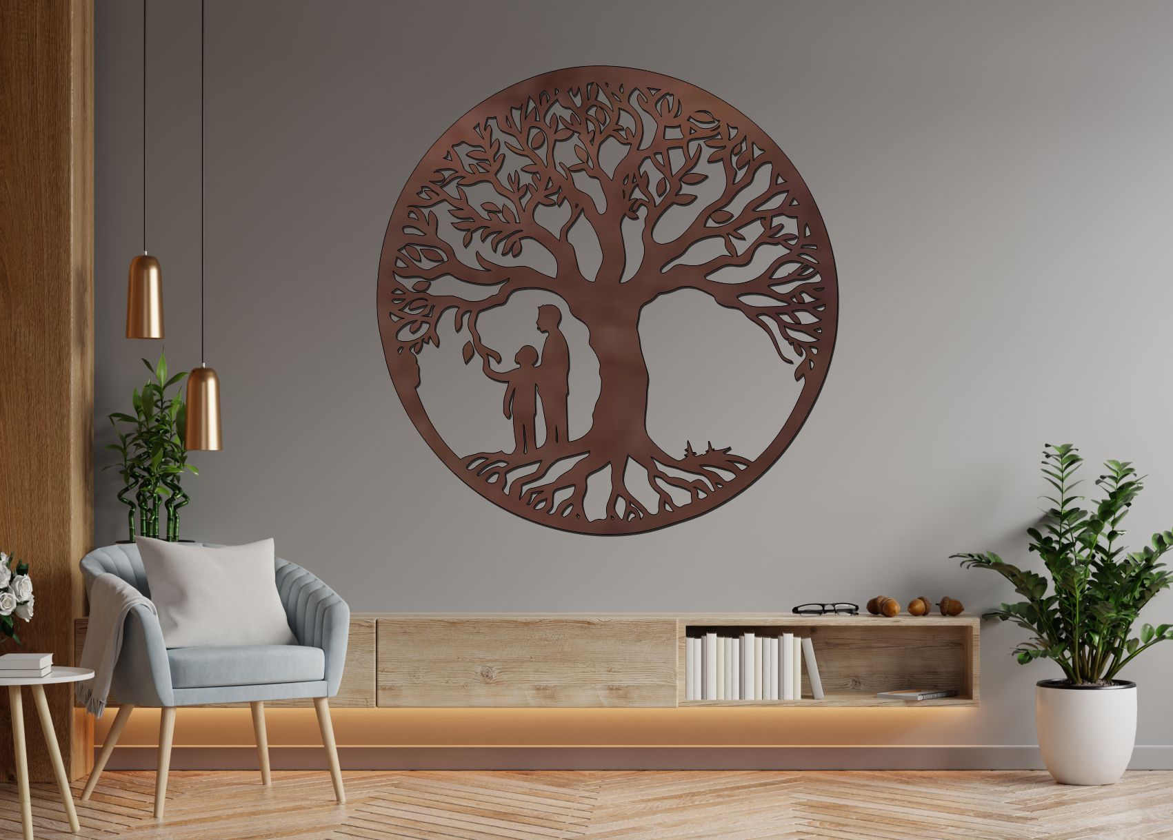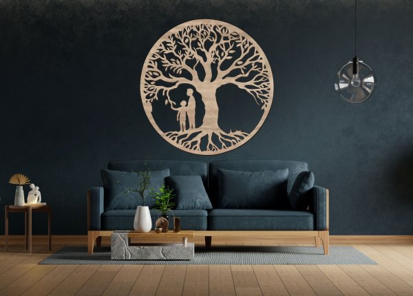 Tento drevený strom života na stenu v sebe nesie silnú symboliku rodiny, ochrany a vzájomnej blízkosti. Jemný siluetový detail pod korunou stromu dodáva obrazu osobný a citlivý rozmer bez konkrétneho určenia – vďaka tomu je vhodný pre každú domácnosť.