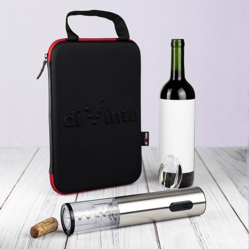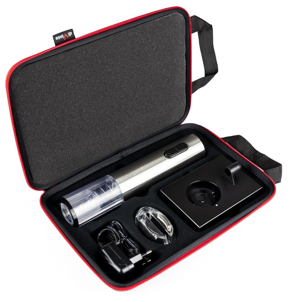 • Sada obsahuje: otvárač na víno so zabudovanou batériou, nabíjaciu základňu, vykrajovátko na fóliu a elegantné puzdro na prenášanie;