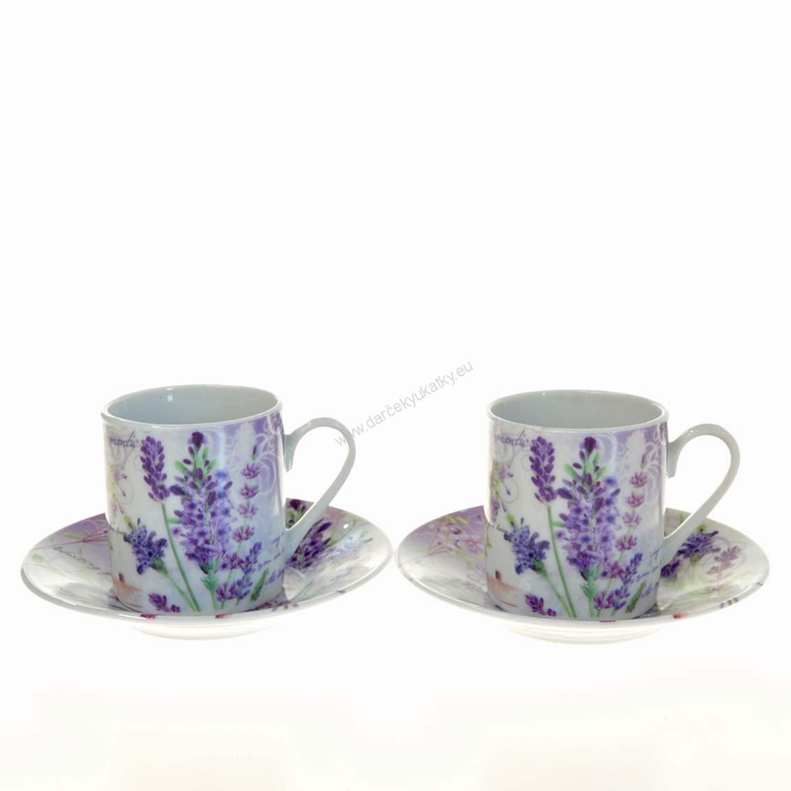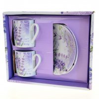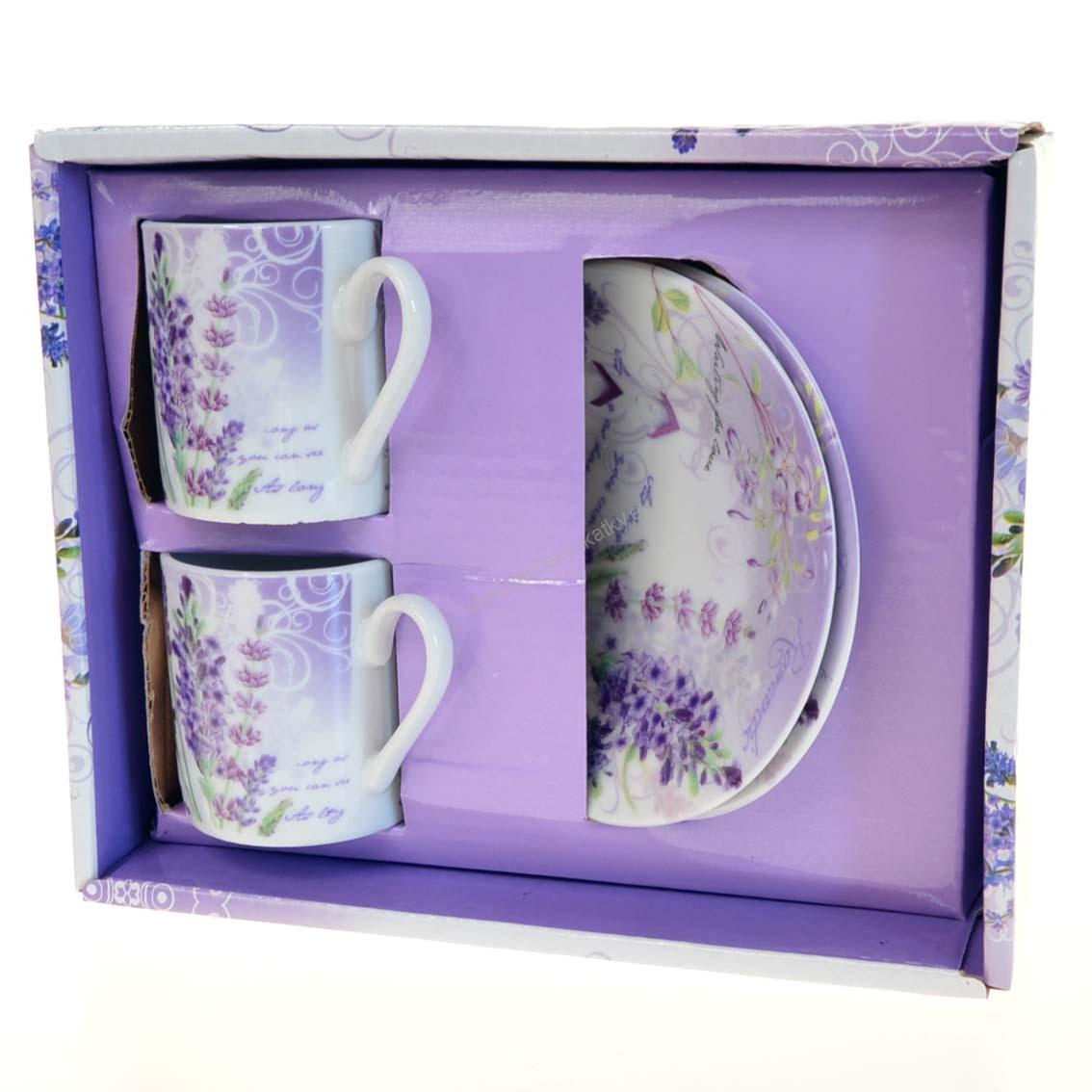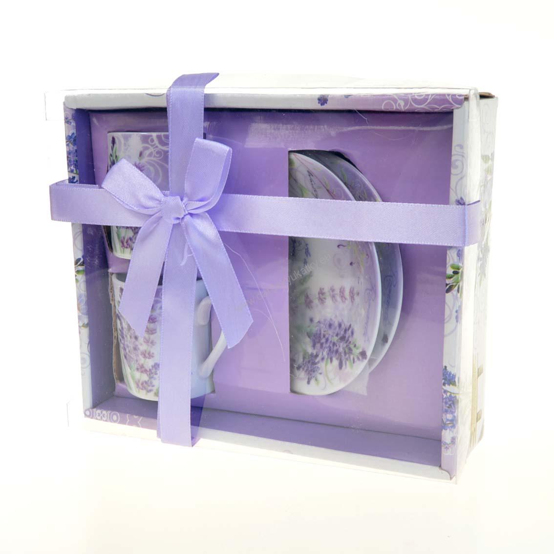 Šálky s podšálkami so vzorom levandule v darčekovom balení.