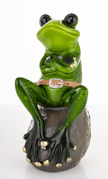 Táto keramická žabka sediaca na kameni je originálna dekorácia, ktorá zaručene vyčarí úsmev každému, kto sa na ňu pozrie. Jej póza s prekríženými rukami pôsobí sebavedomo a trochu namyslene, čo jej dodáva veselý a komický výraz.