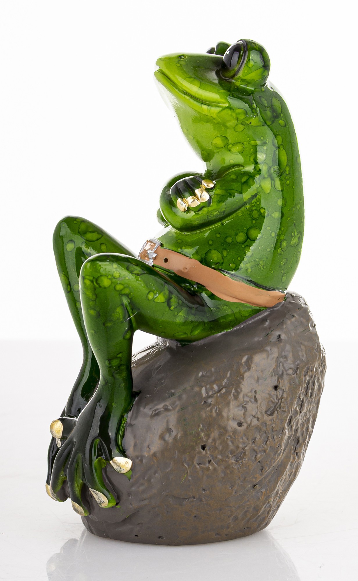 Žabka má krásnu lesklú zelenú farbu s drobnými bodkami, zlaté končeky prstov a opasok, ktorý dotvára jej jedinečný vzhľad. Perfektná je ako darček pre milovníkov humoru, žiab alebo ako veselá dekorácia do domácnosti či kancelárie.