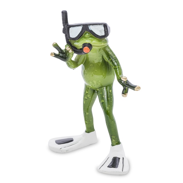 Keramická žabka - Potápač je ručne vyrobená dekorácia s detailným spracovaním, ktorá zaujme každého návštevníka. Jej vtipný vzhľad so šnorchlom, maskou a plavákmi vás rozosmeje a zároveň pripomenie krásu a zážitky z potápania. Táto žabka je stelesnením radosti a dobrodružstva, ktoré prináša podmorský svet.