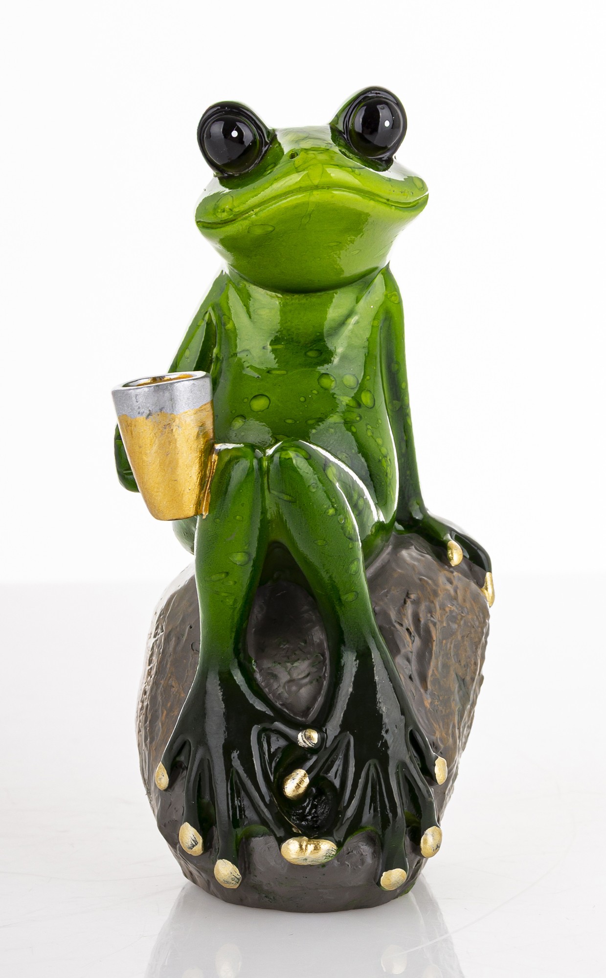 Vďaka svojej lesklej zelenej farbe, zlatým detailom na prstoch a vtipnej póze sa stane originálnou ozdobou domácnosti, záhradného sedenia či dokonca pivárne.