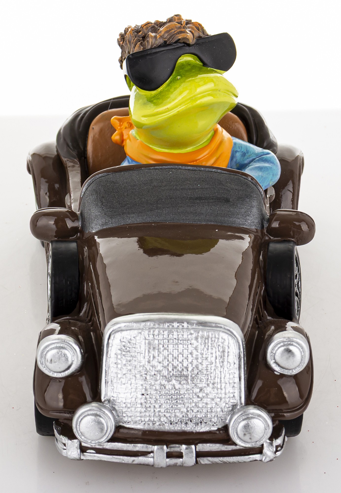Táto keramická žabka – šofér v aute 🐸🚗 je dokonalým stelesnením elegancie a humoru v jednom. Sedí v štýlovom hnedo-sivom retro kabriolete, s okuliarmi na očiach a šálom okolo krku, pripravená vyraziť na cestu.
