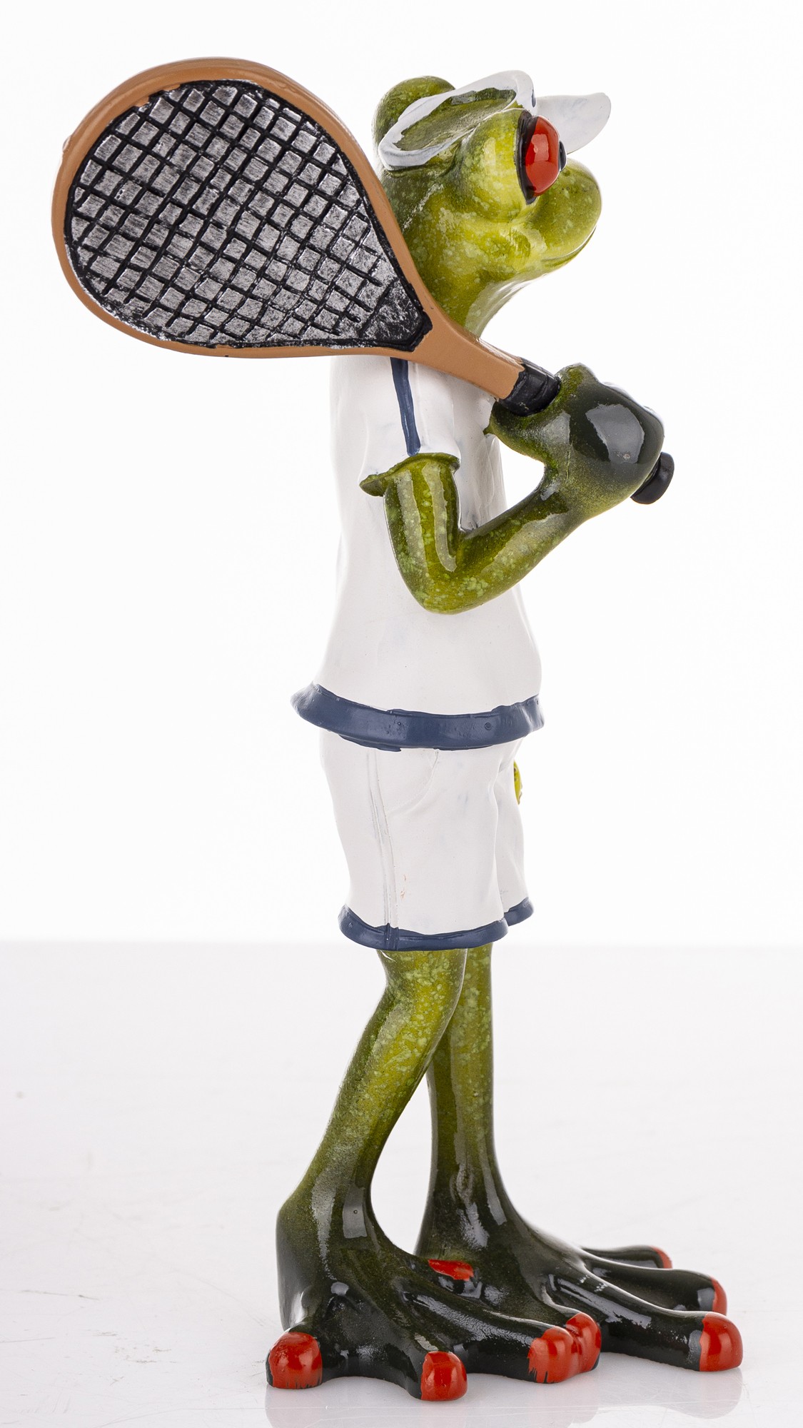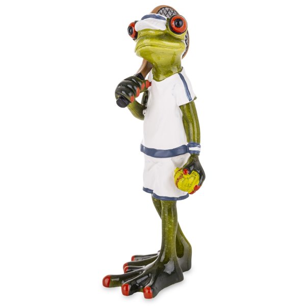 Táto keramická žabka – športový tenista je veselou dekoráciou pre všetkých fanúšikov tenisu. Žabka má na sebe biely tenisový úbor, šiltovku a pevne drží tenisovú raketu pripravenú na zápas. Jej dlhé nohy a výrazné oči jej dodávajú typický komický šarm, vďaka ktorému sa okamžite stane stredobodom pozornosti.
