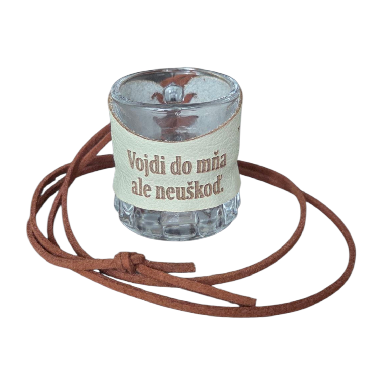 🥃 Sklenený štamperlík s koženým obalom – Pálenôčka si ma zradila, na zem si ma zhodila.