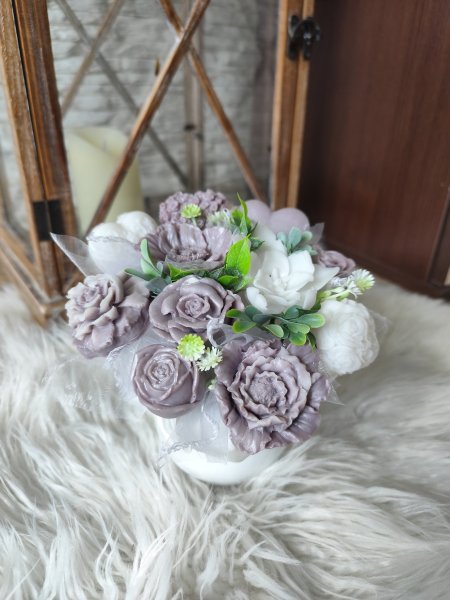 Mydlová kytica je jedinečná dekorácia a originálny darček, ktorý spája krásu kvetov s praktickosťou mydla. Každý kvet je starostlivo vyrobený z mydlovej hmoty, vďaka čomu si kytica zachováva svoj nádherný vzhľad a príjemnú vôňu po dlhý čas. S rozmermi 18 x 17 cm je ideálnou voľbou pre narodeniny, meniny, svadby či len tak pre potešenie.