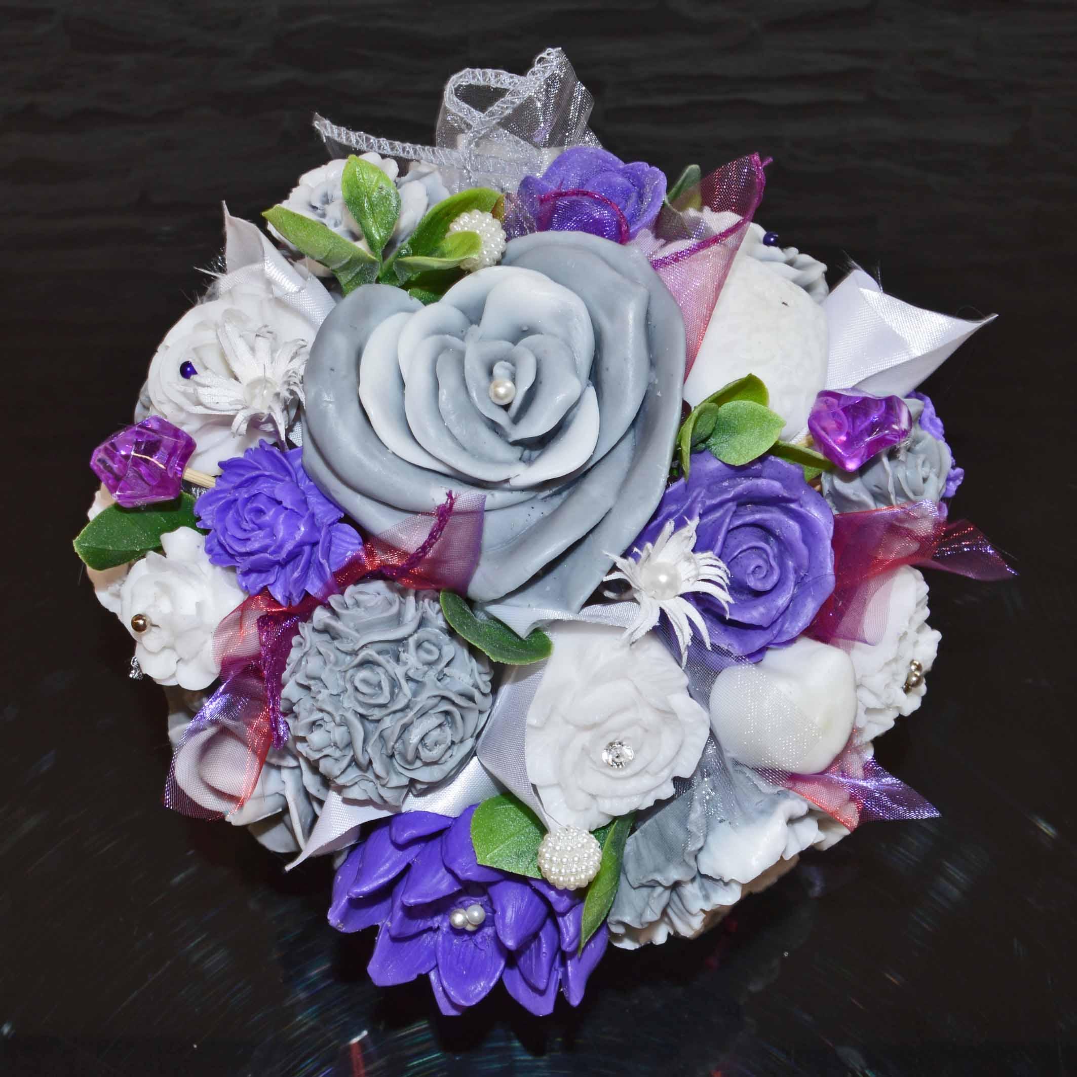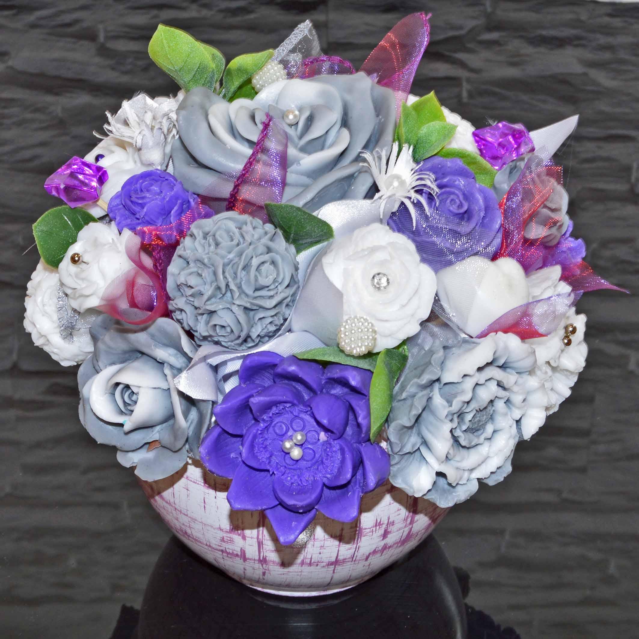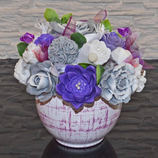 Mydlová Kytica v keramickom kvetináči - fialová, sivá, biela