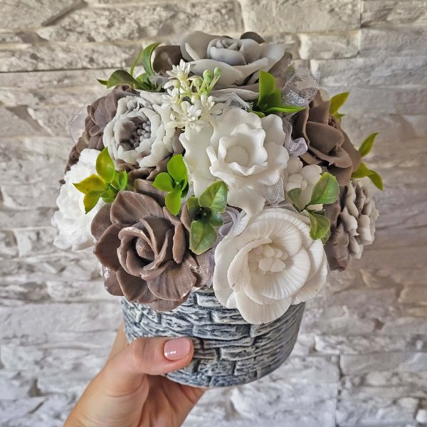 Už ste niekedy hľadali darček, ktorý by bol nielen krásny, ale aj praktický a trvácny? Ponúkame vám ideálnu voľbu - Mydlovú kyticu v keramickom kvetináči. Tento unikátny kúsok nie je len obyčajný darček. Je to skúsenosť, ktorá premení každodenné umývanie na luxusný wellness rituál. Mydlová kytica je vytvorená z jemných mydiel v tvare kvetov, ktoré sú aromaticky voňavé a sú zasadené v elegantnom keramickom kvetináči. Každý kvet je ručne vyrobený a starostlivo navrhnutý, aby vytvoril dokonalý vizuálny efekt. Na rozdiel od tradičných kvetových darčekov, mydlová kytica neuvädne. Svojou krásou a vôňou poteší darovanú osobu dlhší čas. Tým sa stáva nielen ekonomickou, ale aj ekologickou voľbou.