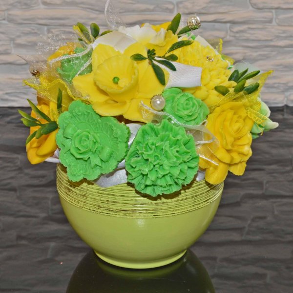 Mydlová kytica v keramickom kvetináči je voňavý darček pre každú tetu či babku k sviatku.