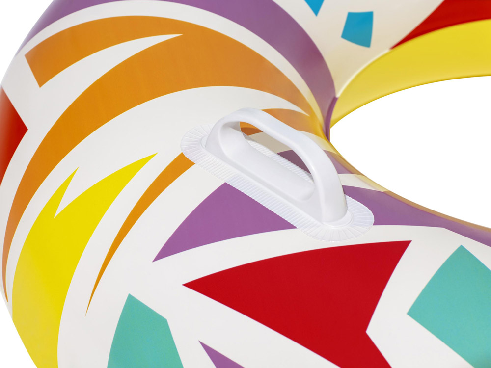 Skvele sa vám bude hodiť na relax pri mori, pri jazere, ale aj pri bazéne na dvore. Nezvyčajná retro grafika a intenzívne farby upútajú pohľady a pozornosť slniečkárov. Vstavané, odolné rukoväte umožňujú deťom aj dospelým pevne sa držať pri plavbe vo vlnách. Stačí nafúknuť koleso a ste pripravení na letnú zábavu pri bazéne.