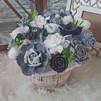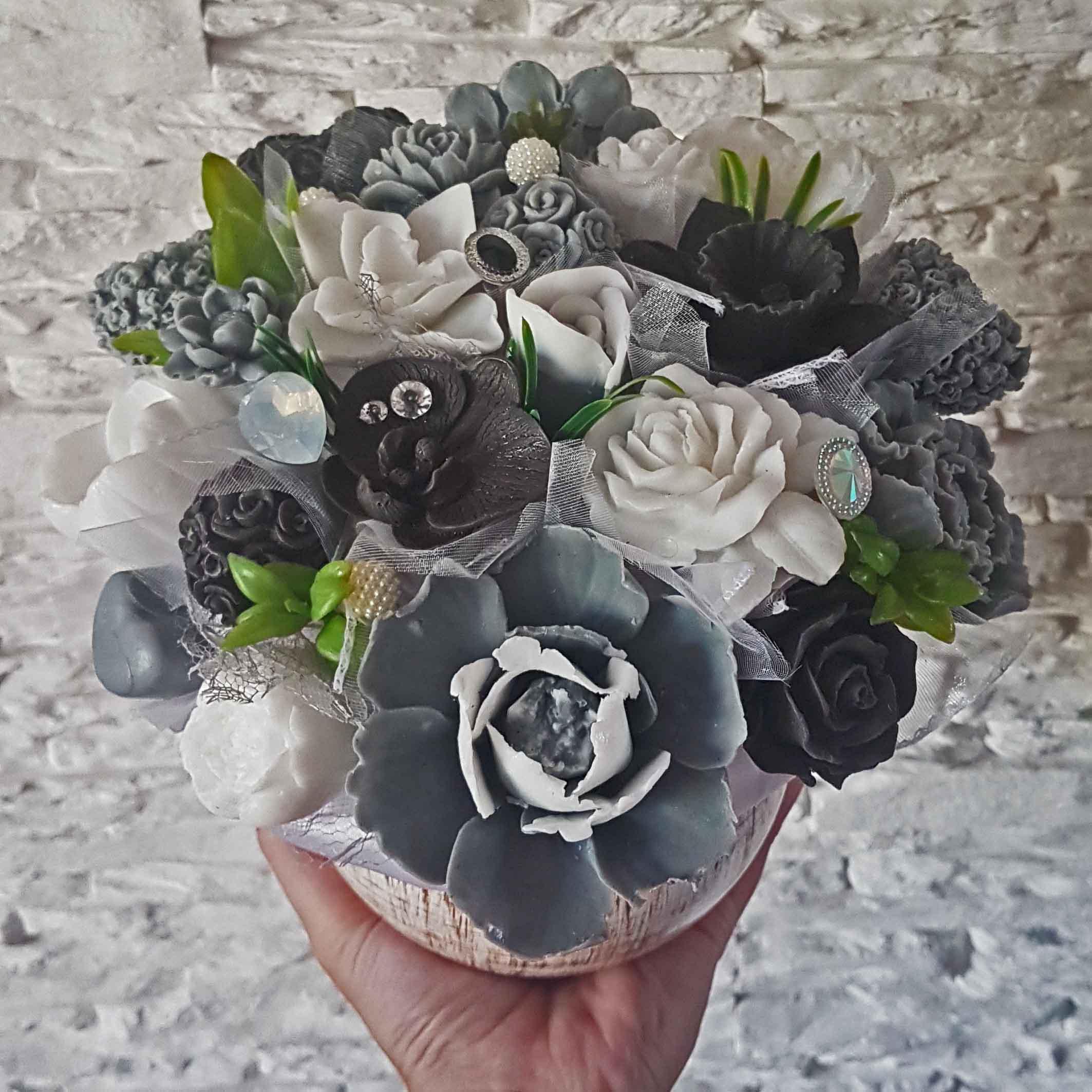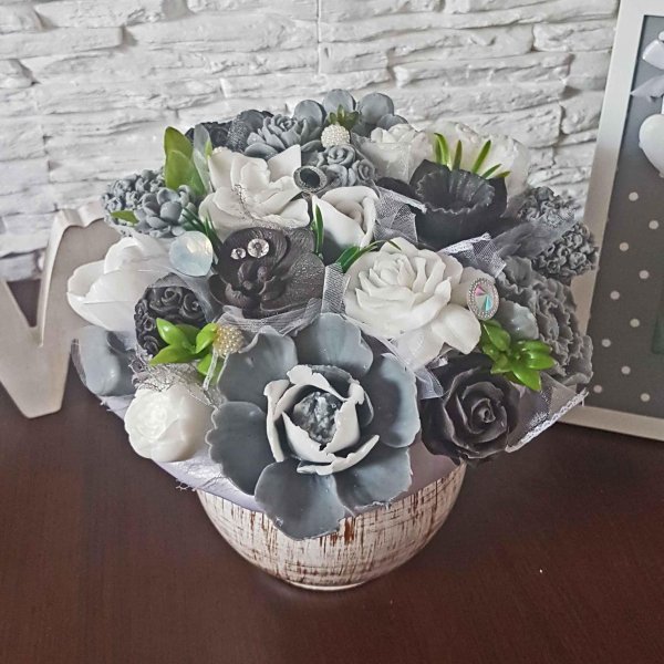 Predstavujeme Vám originálnu mydlovú kyticu - dokonalú kombináciu elegancie a užitočnosti, ktorá oslní svojím vzhľadom a vôňou. Táto ručne vyrábaná kytica, v nádherných odtieňoch sivej a bielej, je viac než len obyčajný darček. Je to prejav pozornosti, ktorý zanechá trvalý dojem.