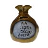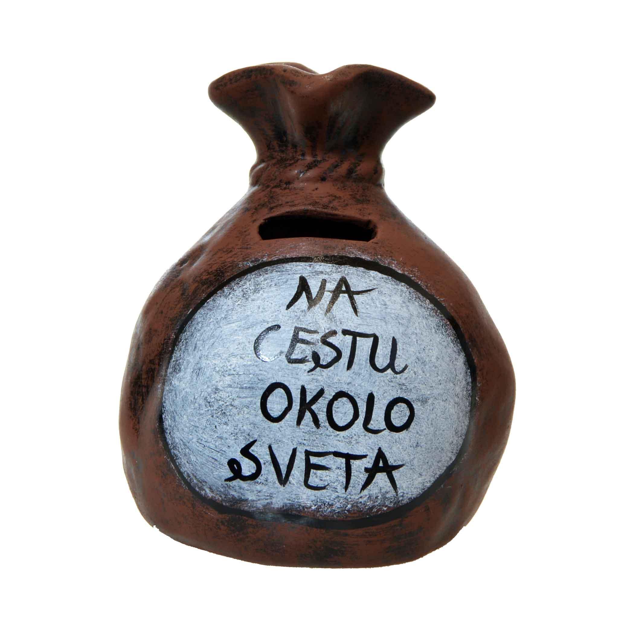 Krásna keramická pokladnička na peniaze v tvare mešca s nápisom: na cestu okolo sveta je skvelý darček pre rodičov.