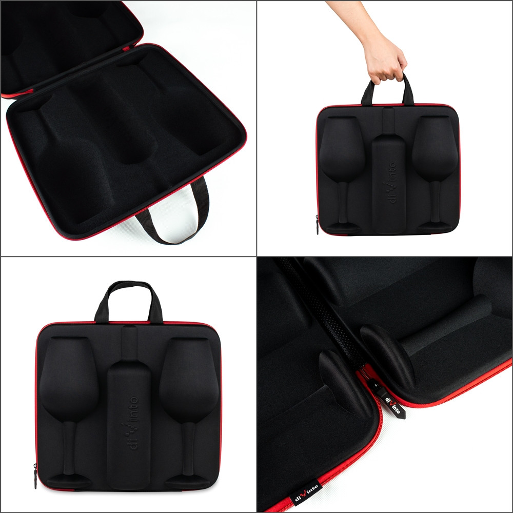 Darčekové puzdro na fľašu a poháre diVinto. Obal zabezpečí bezpečnosť pohárov a fľašky v obale. Darčekové balenie je vhodné ako darček pre každého milovníka vína a nie je potrebné už ďalšie balenie.