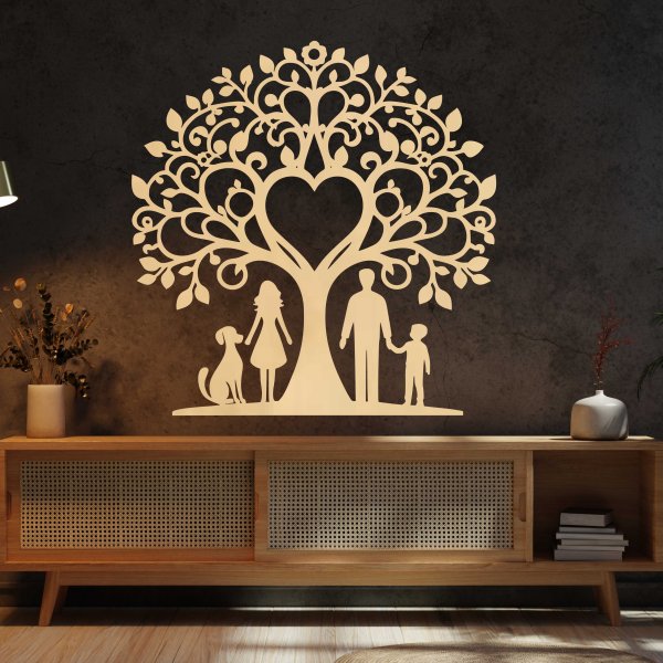 Predstavte si, že každý deň, keď vstúpite do svojho domova, vás privíta symbol rodinného zázemia, lásky a spolupatričnosti. Naša nová dekorácia - Rodinný strom z dreva na stenu - Otec, mama, syn a pes, je viac než len obyčajná ozdoba. Je to každodenná pripomienka toho, čo v živote najviac znamená.