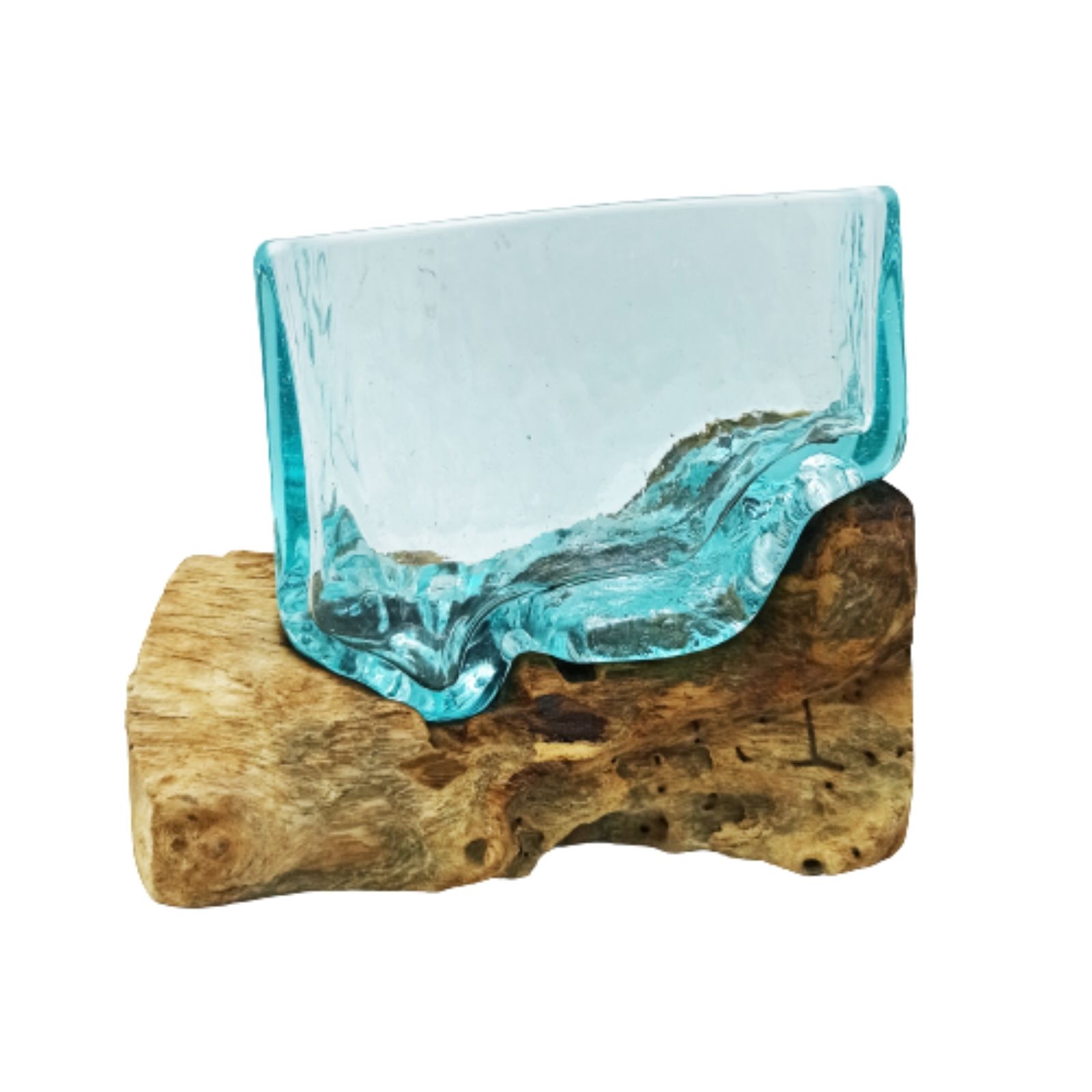 Roztavené sklo na dreve - 2 x Veľká hranatá miska sú nový hit, ktorý k nám prichádza z Bali. Ručne vyrábané fúkaním z recyklovaného skla a koreňov z dreva Gamal. Ešte horúce sklo sa umiestni na výrez koreňa a nechá sa zatvrdnúť do tvaru dreva čím sa zaistí jeho dokonalé uchytenie. Každý z týchto výrobkov je jedinečný.