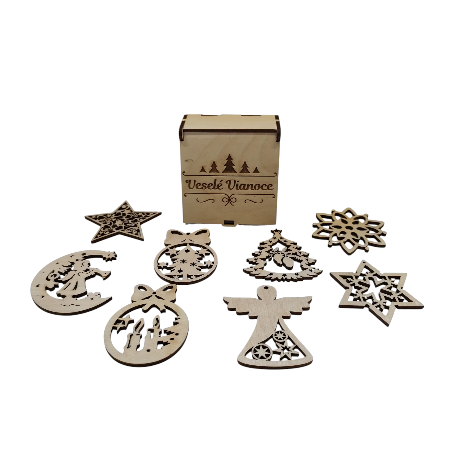 Sada drevených vianočných ozdôb – Veselé Vianoce (8 ks)
