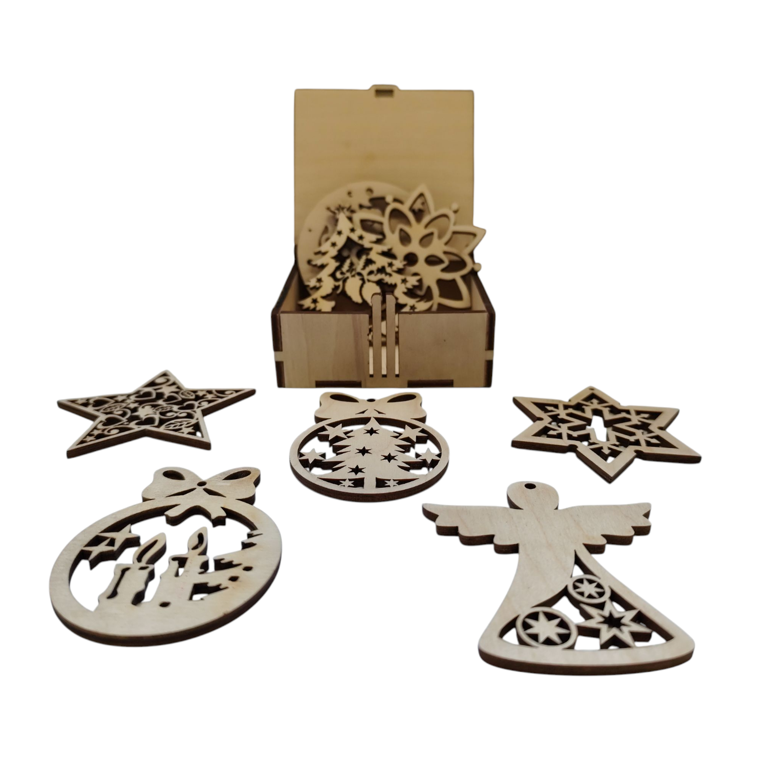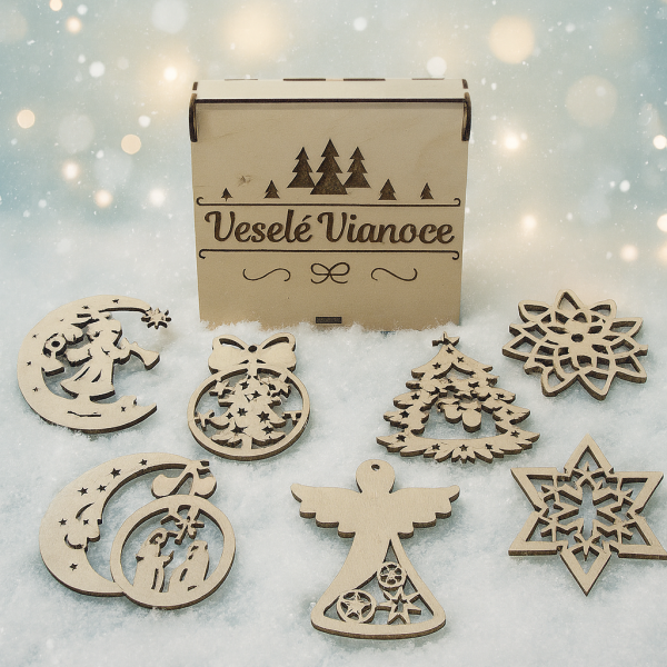 Ozdoby sú vyrezané laserom, čo zaručuje čisté línie, krásne detaily a elegantný vzhľad. Sú vyrobené z kvalitnej preglejky, príjemne ľahučké a pripravené na okamžité zavesenie.